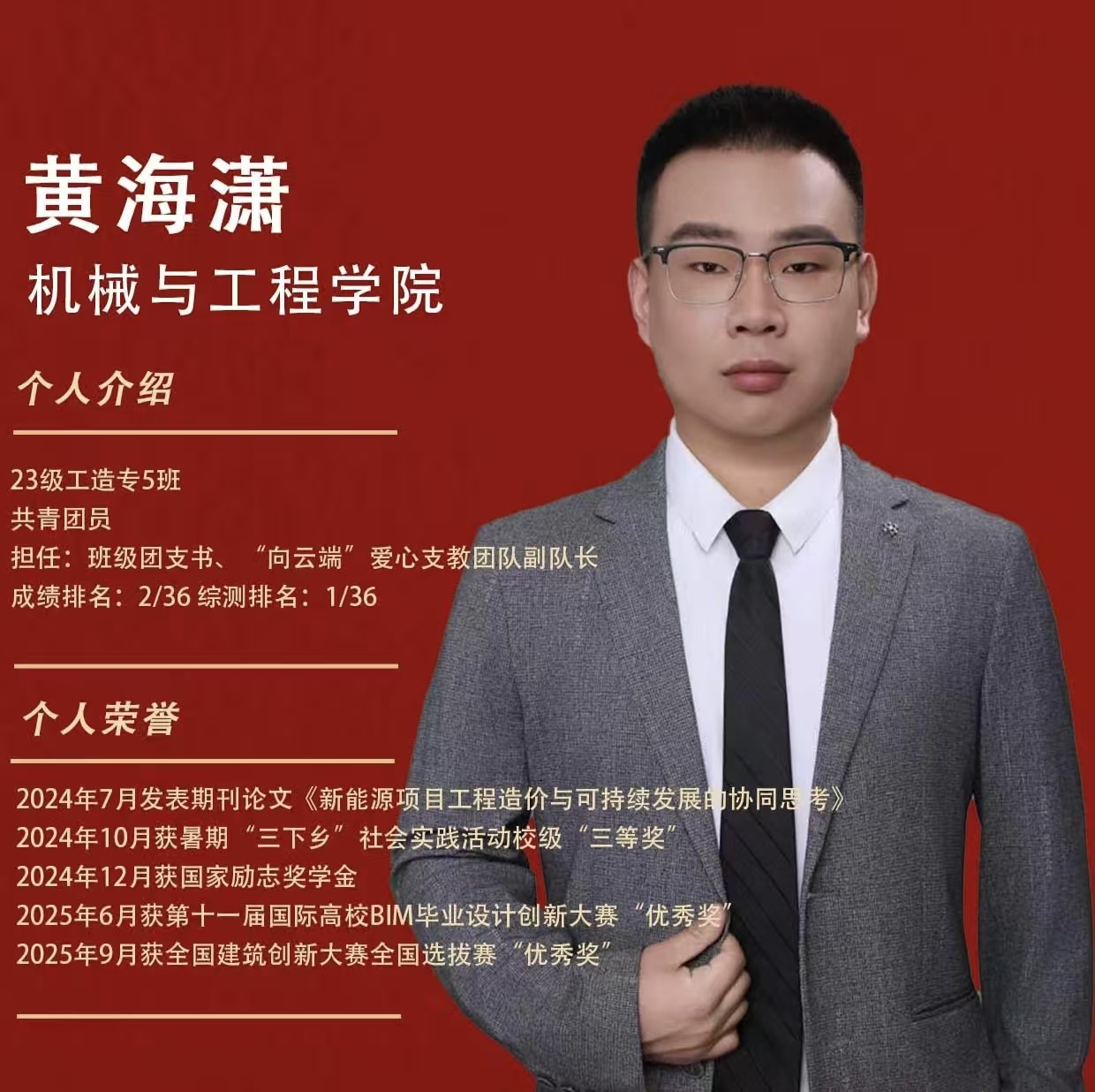 “获得国家奖学金,是对我过去努力的肯定,更是对‘求真务实’理念的深刻诠释——这份理念,就藏在我课堂上逐字啃透知识点的较真里,也融在造价建模中反复优化的耐心间。”在谈到获得国家奖学金的感受时,2023级工程造价专业的黄海潇不禁说道。