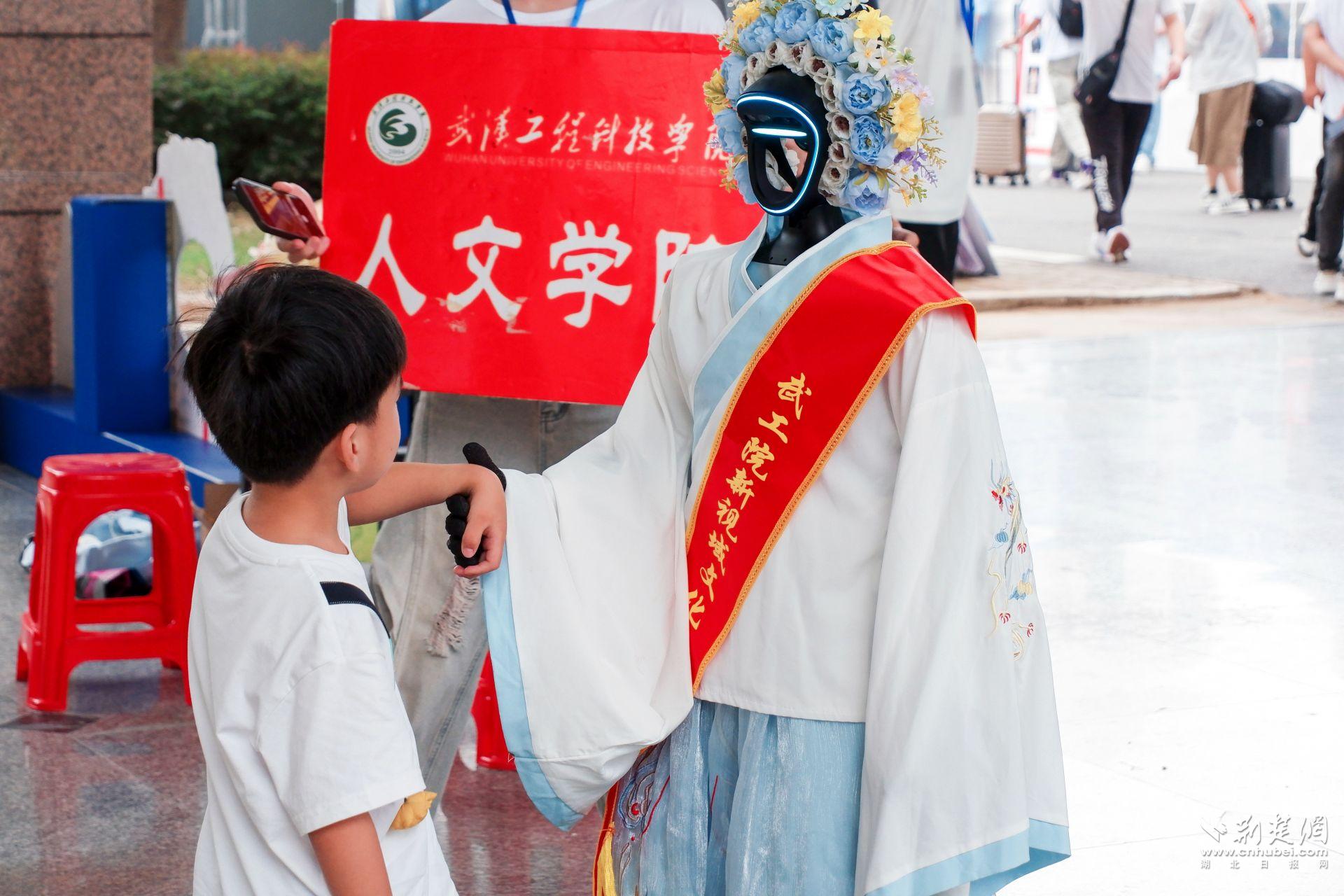 荆楚网(湖北日报网)讯9月10日,武汉工程科技学院2025级新生陆续报到。今年的人文学院迎新现场,一位特别的“志愿者”吸引了广泛关注——机器人“小文文”。它身着蓝色汉服、头戴簪花,胸前挂着“武工院人文学院欢迎您”的红锦带,将人工智能与中华优秀传统文化融为一体,成为迎新现场的亮点。