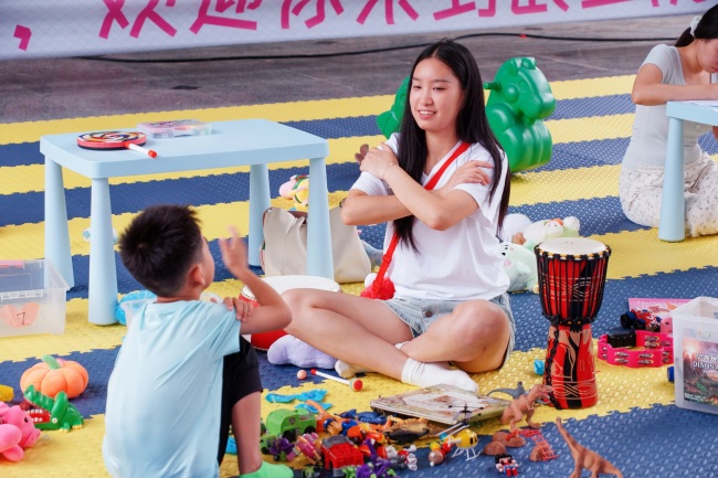 报到期间,不少新生携全家一同来报道。报到高峰期,许多携幼童前来的家庭面临着一边办理手续、一边照顾幼儿的困难与不便。为缓解这一难题,武汉工程科技学院专门设置了“儿童游乐区”,为新生家长提供免费的临时儿童托管服务。该区域由学校人文学院学前教育专业的同学担任志愿者,通过绘声绘色地讲故事、带领小朋友读绘本、组织互动游戏等方式,悉心陪伴儿童等,让他们在轻松愉快的氛围中度过等待的时光。
