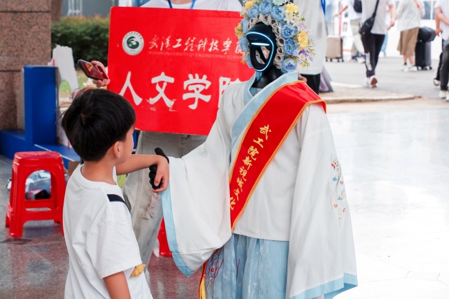 在人文学院迎新处,“小文文”不断向新生与家长挥手示意,并用清脆的声音说道:“你好,我是小文文,欢迎你来到武工院。”在人群中,2025级人文学院英语专业新生吴薇薇的父亲李威正在拍照。他感慨地说:“我第一次看到机器人迎新,既新鲜又有趣。机器人穿着汉服的样子很有中华文化特色,也让我感受到学校把科技与传统结合在一起的用心。”人文学院副院长吴海燕介绍:“本次迎新活动安排机器人参与,目的是想实现智能迎新高效报到,无缝衔接新生入学;同时这类智能体系也会应用到教学领域,为学生构建高效的数字学习新生态。”