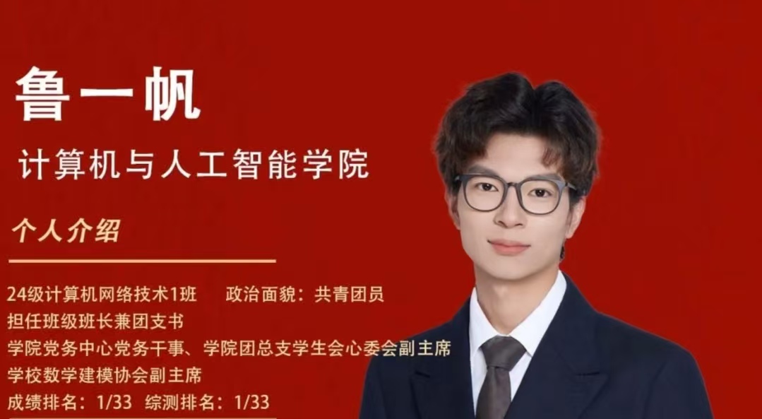 “得知获得国家奖学金时,我感到既惊喜又意外,满怀对学校、学院及辅导员老师的感恩,这份荣誉既是对过往坚持与付出的认可,也是‘自律者方得自由’的印证,更为同学提供了一个可复制的成长样本。”在谈及国家奖学金时,2024级计算机网络技术专业的鲁一帆