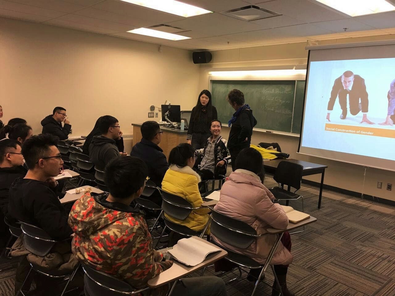 当地时间2016年12月13日星期二上午072团在维多利亚大学听教授给大家讲性别认知。教授先从自身的着装、嗓音等方面让大家了解我们是通过何种方式来认知性别的。接着又让两组男生两组女生分别表演异性打招呼...