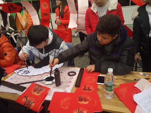 本网讯学通社记者余睿胡方圆天将化日舒清景室有春风聚大和。丹凤呈祥龙献瑞红桃贺岁杏迎春。近日在武汉工程科技学院二食堂门口悬挂起了近两百副春联。有学生坐在桌前细细磨墨正在一笔一画地写着光一个福字就有楷书、...