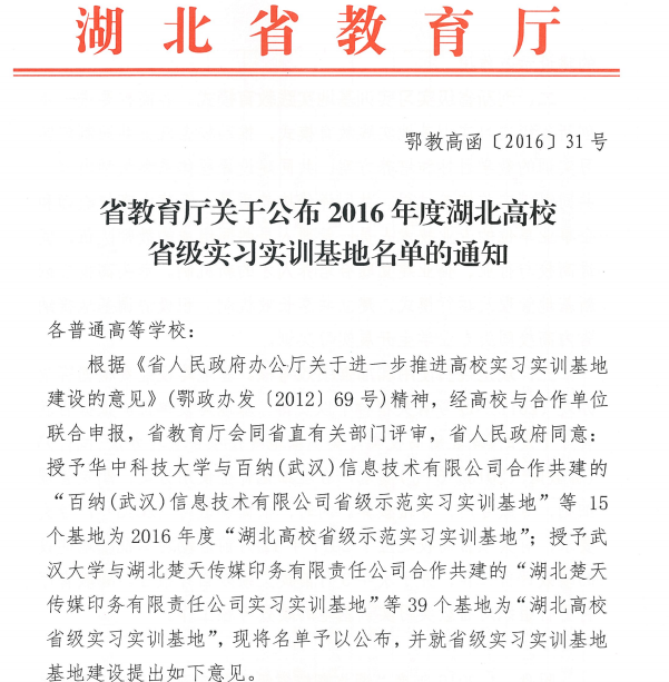 本网讯:文宣近日湖北省教育厅公布2016年度湖北高校省级实习实训基地名单武汉工程科技学院牵头的武汉高德红外股份有限公司校外实习与就业基地成功获批为2016年度湖北高校省级实习实训基地此次全省仅39个基...