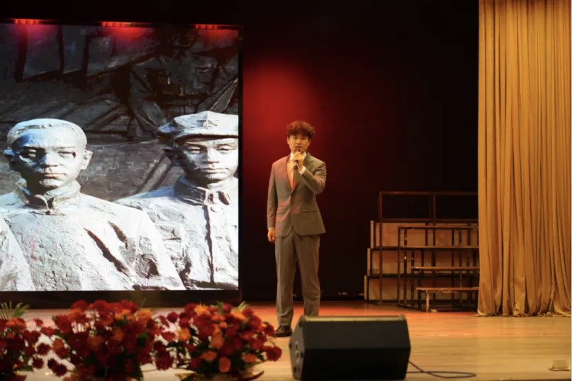 活动尾声,中南民族大学教授伍莉与校红星合唱团共同唱响《我和我的祖国》,用深情的歌声表达对祖国的热爱,将现场气氛推向高潮。