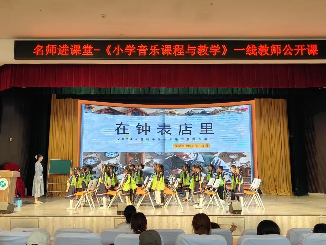 明熙小学优秀教师余诗曼和廖唱带领36名小学生为小学教育专业同学展示了《可爱的小象》及《在钟表店里》两场公开课。余诗曼老师以趣味节奏游戏导入,通过AI制成的傣族小女孩形象,引导36名小学生在旋律中感受节拍韵律;廖唱老师通过让小学生欣赏乐曲,生动有趣地模仿钟表的动作迅速抓住了学生们的注意力。小学生亲身体验各种乐器,积极参与到表演中去,课堂氛围热烈活泼。武汉工程科技学院小学教育专业学生全程观摩,近距离体验一线教学场景,感受音乐教学新范式。