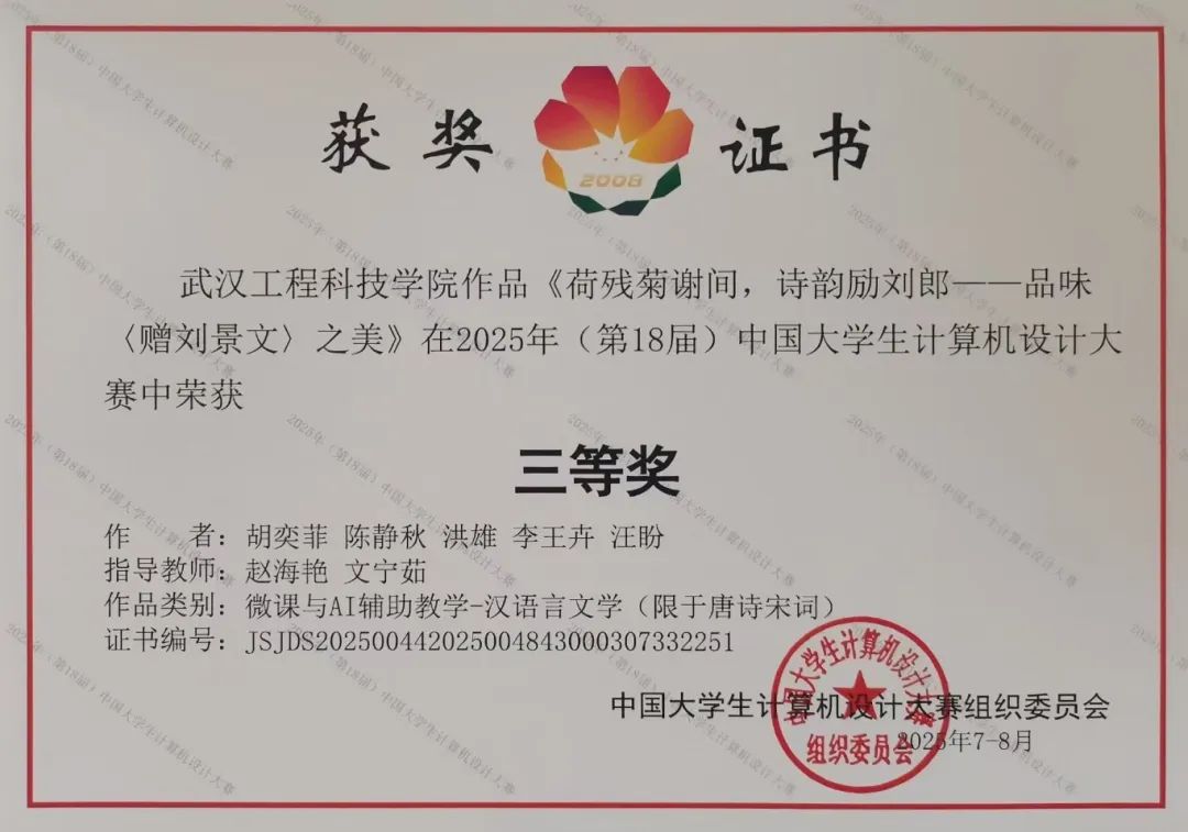 第18届中国大学生计算机设计大赛——“微课与AI辅助教学”南京南决赛已于近日在南京大学落下帷幕。经过激烈角逐,武汉工程科技学院人文学院学子胡奕菲、陈静秋、洪雄、李王卉、汪盼五位同学组成,赵海艳和文宁茹指导的团队参赛作品《荷残菊谢间,诗韵励刘郎——品味<赠刘景文>之美》荣获全国三等奖。