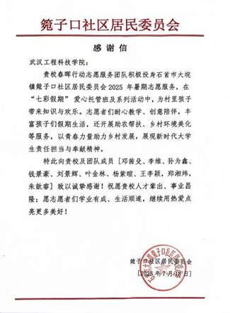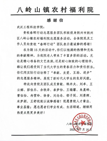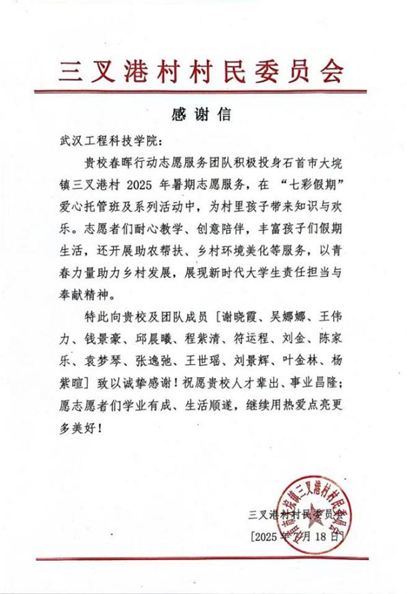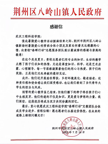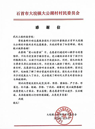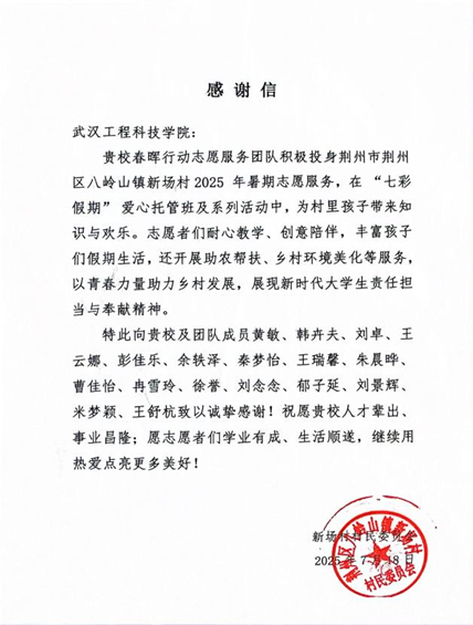 为认真学习贯彻习近平新时代中国特色社会主义思想,深入贯彻党的二十大和二十届三中全会精神,一支由退役军人和在校大学生组成的春晖行动团队,于 2025年6月23日奔赴湖北省荆州市的大公湖村、三叉港村、杨柳沟村、新场村及箢子口社区五地,开展了为期三十余天的暑期“三下乡”实践活动。武汉工程科技学院48名团队成员充分发挥自身优势,为乡村教育与发展注入青春活力与青年智慧。