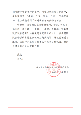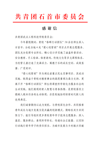 此次春晖行动团队在湖北荆州开展的暑期“三下乡”社会实践活动,不仅给当地的留守儿童和村民们带来了实实在在的帮助和关怀,也让团队成员在实践中得到了锻炼和成长。他们的辛勤付出和真心奉献,赢得了当地政府与群众的广泛认可和高度赞誉。活动期间,团队共收到来自市、镇、村各级单位的感谢信8封,以及承载着淳朴敬意的锦旗3面,还被授予石首市“志愿服务优秀团队”称号。