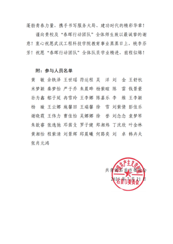 春晖行动团队以实际行动诠释了大学生的责任与担当,为乡村教育与发展注入了源源不断的动力。一直以来,武汉工程科技学院青年学子积极投身于乡村建设,用青春和汗水书写精彩的故事,为实现乡村振兴战略目标、为建设美丽中国贡献青春智慧和力量。