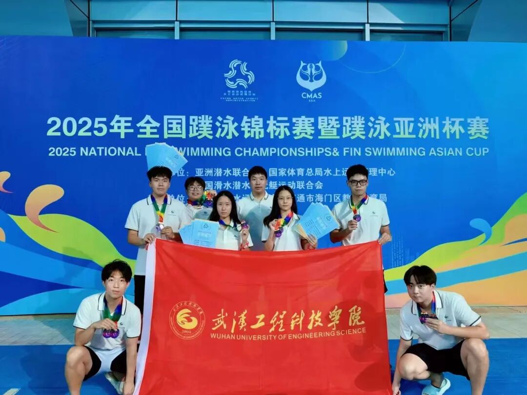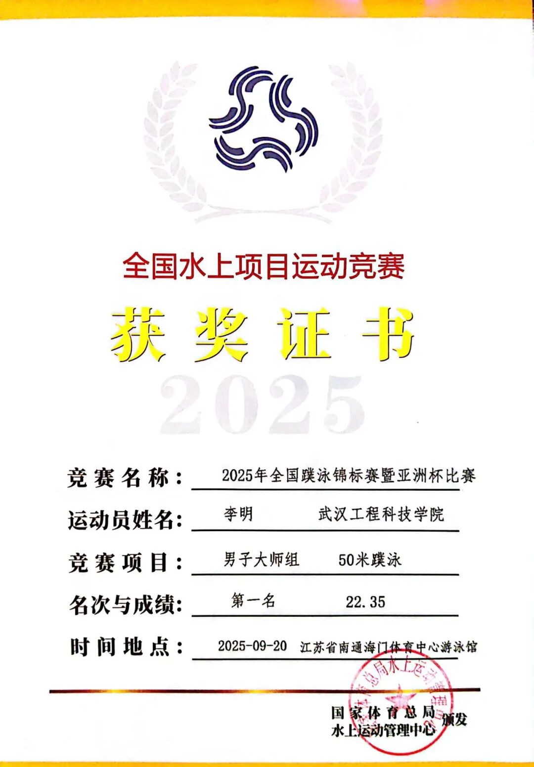 9月22日,2025年全国蹼泳锦标赛暨亚洲杯赛在南通市落幕,武汉工程科技学院游泳队在教师郭生鼎、胡承孝、李明的带领下奋勇拼搏,展现了出色的竞技水平和良好的精神风貌。教师李明获得大师组男子50米蹼泳第一名,50米双蹼第二名。人文学院2022级学生李大培获得男子(高校组)400米蹼泳第四名,1500米蹼泳第四名。