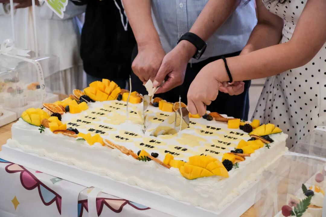 在小提琴演奏者现场演奏的生日歌及志愿者的伴唱声中,生日蛋糕被缓缓推到现场中央。学校领导与新生代表一同切开蛋糕为新生庆生。