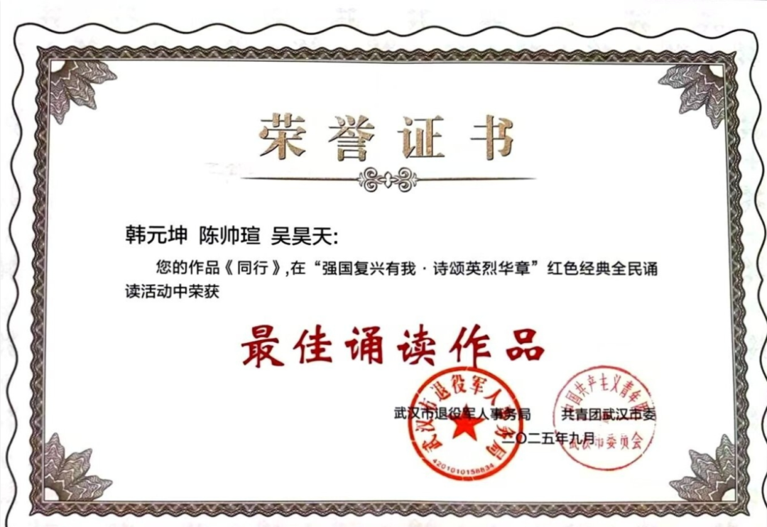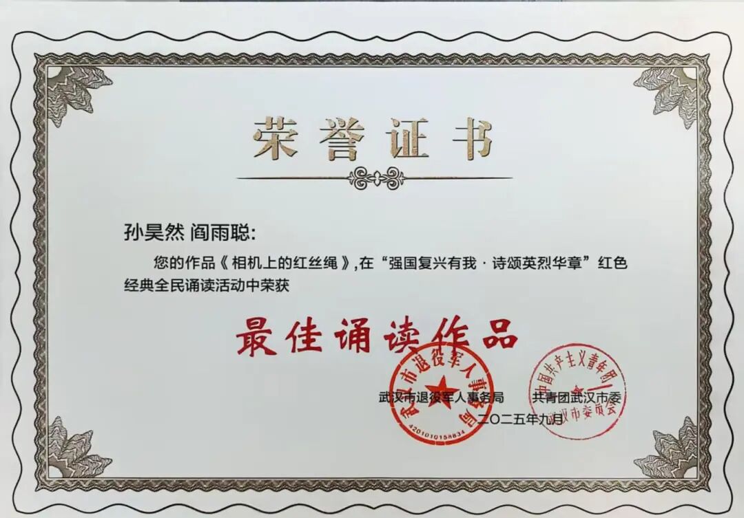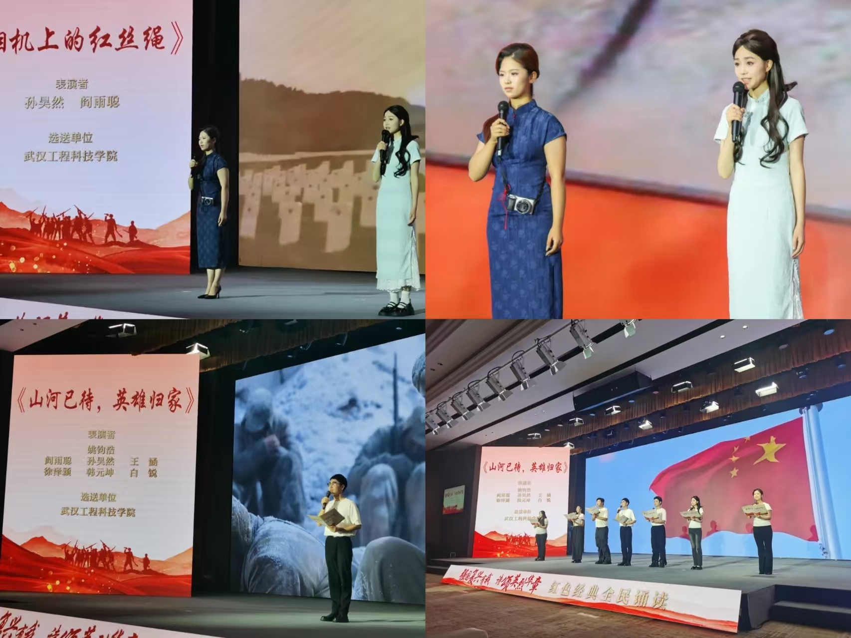 9月27日,由武汉市退役军人事务局、共青团武汉市委联合举办的红色经典全民诵读活动颁奖典礼在长江日报演播厅举行,武汉工程科技学院艺术与传媒学院师生在广播电视系主任冯威的组织下,携佳作亮相舞台。2023级播音与主持艺术专业学生阎雨聪、孙昊然携作品《相机上的红丝绳》参与成果展示;教师姚钧浩与学生阎雨聪、孙昊然、徐泽颖、王涵、韩元坤、白锐受邀参演的《山河已待,英雄归家》作为压轴节目登场。
