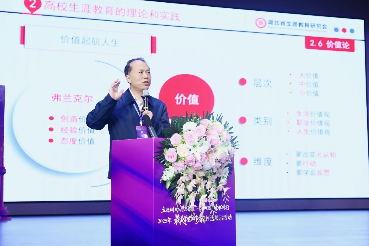 原湖北省教育厅副厅长、一级巡视员、湖北省生涯教育研究会会长张金元为活动致辞。他深入分析了当前高校辅导员的职业发展趋势和职业困惑。他指出,辅导员在职业发展中要明确目标,做好当下,抓好关键,提升能力,引导青年大学生涵养家国情怀,锤炼意志品质,增强做中国人的志气、骨气、底气,勇担时代责任和历史使命,自觉把个人的理想追求融入国家和民族的事业中。“辅导员是学生青春路上的‘点灯人’,是高校育人工作的‘排头兵’,更是党和国家教育事业的‘铺路石’。希望大家以本次活动为契机,争做‘有情怀’‘有本领’‘有温度’的新时代辅导员,为加快建设教育强国、办好人民满意的教育贡献更多智慧和力量。”最后,他预祝2025年“最美学生工作者”评选展示活动取得圆满成功。