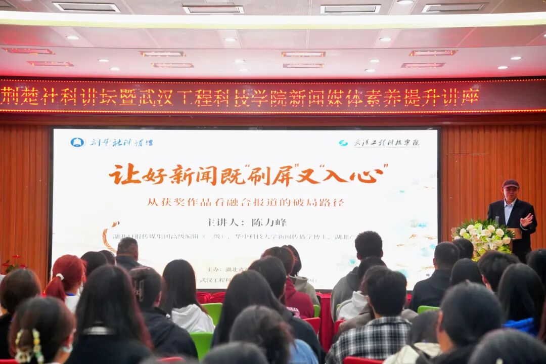 为进一步加强新闻宣传队伍建设,提升高校新闻工作者的专业素养,10月23日下午,荆楚社科讲坛暨武汉工程科技学院新闻媒体素养提升讲座在学校事务中心311举行。本次讲座特邀湖北日报传媒集团高级编辑(三级),中国新闻奖、长江韬奋奖、中国地市报年度新闻奖评委陈力峰担任主讲人。湖北省社科联科普部主任徐维洲,武汉工程科技学院人文学院副院长吴海燕出席活动,学校各单位宣传员、校融媒体中心全体成员参与讲座。