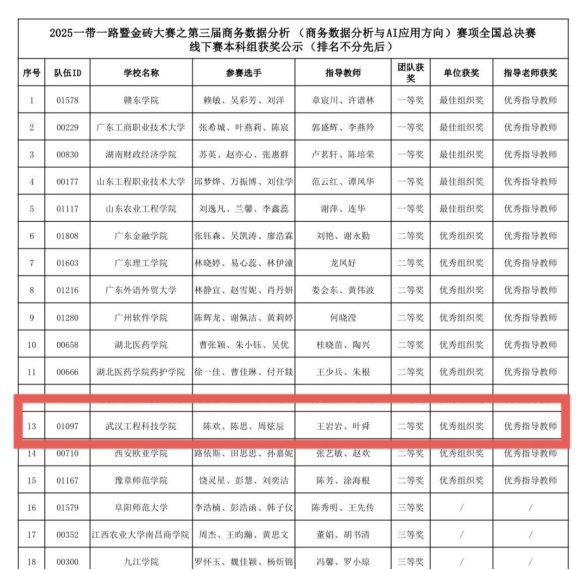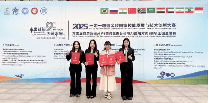 近日,2025一带一路暨金砖国家技能发展与技术创新大赛第三届商务数据分析(商务数据分析与 AI 应用方向)赛项全国总决赛传来喜讯,武汉工程科技学院本科组陈欢、陈思、周炫辰(指导老师王岩岩、叶舜)凭借扎实的专业知识、出色的数据分析能力与创新的AI应用解决方案,在激烈的竞争中脱颖而出,荣获全国总决赛二等奖,学校荣获优秀组织奖,指导老师荣获优秀指导教师奖。