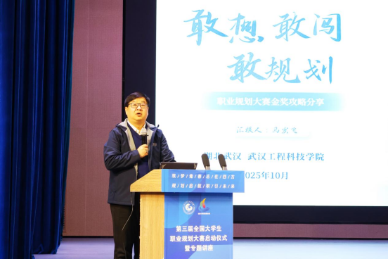 马宏飞作题为《敢想,敢闯,敢规划——职业规划大赛金奖攻略分享》的专题讲座。他围绕“敢想”挖掘潜能、“敢闯”探索路径、“敢规划”提升技巧等方面,以丰富的评审与指导经验进行了系统讲解。讲座内容深入浅出,语言生动有力,现场掌声不断。