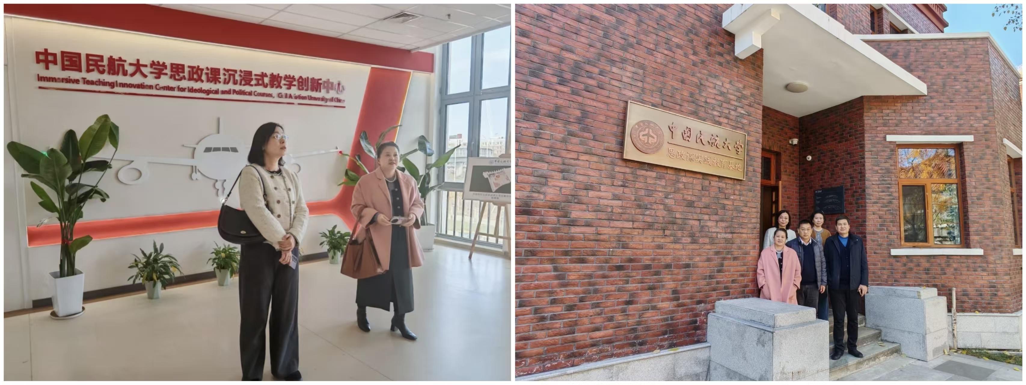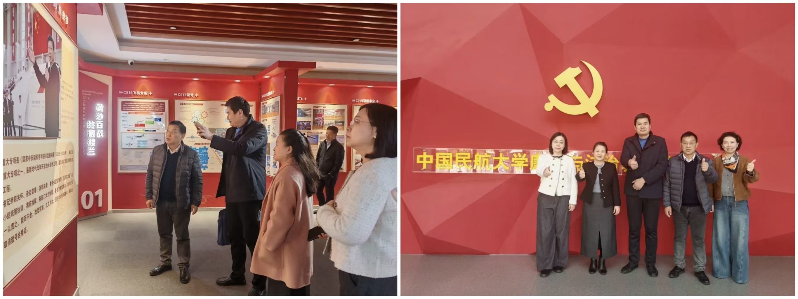 交流会后,张会利书记带队赴中国民航大学马克思主义学院开展“十五五”思政课建设规划调研,中国民航大学马克思主义学院王庆西院长介绍了学校思政课建设思路和“一课一基地”的具体做法,并带领参观了国产大飞机与适航科普教育基地、思政课沉浸式教学创新中心、廉洁与法治教育教学基地、中国民航大学思政课实践教育基地等多个教学场所。