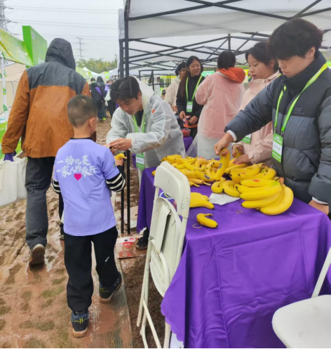 清晨7时,武汉初冬的清晨已有些许寒冷,天上飘着小雨,志愿者们此时已在起点集结完毕,迅速进入 “路线引导、补给保障” 两大岗位。在补给站,同学们熟练地为小选手递上补给包,同时提醒小朋友:“慢些喝,补充水分后记得活动脚踝哦!”同学们在野外生存实训中掌握的“运动补水科学方法”此刻成为服务亲子家庭的实用技巧。