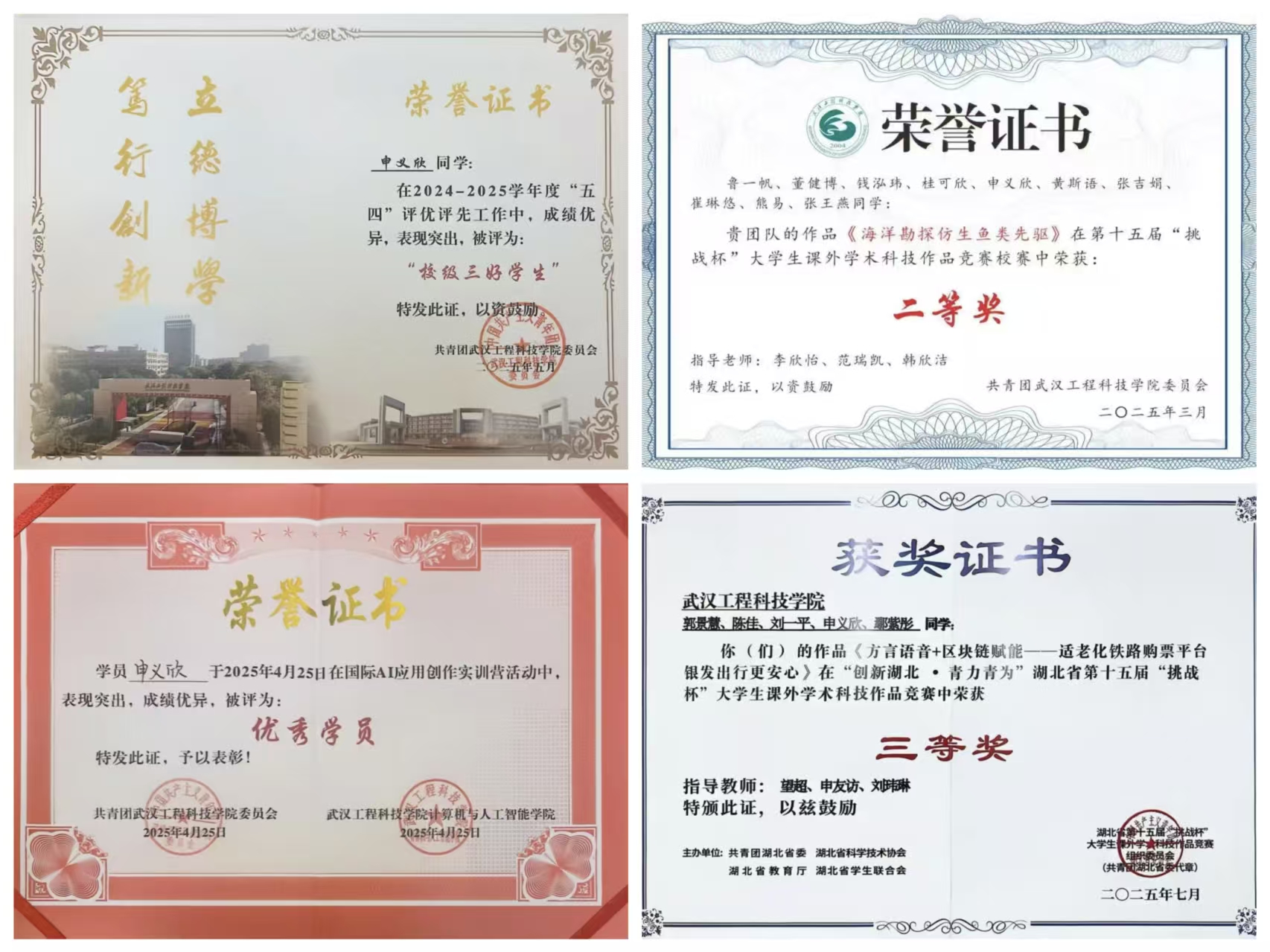 努力,是给自己最好的交代。自入学以来申义欣保持着积极进取的心态,无论是在日常的学习生活还是实践活动,他都全力以赴。他在学业成绩上做到专业第一,综测成绩上做到专业第三,并申报了实用新型专利。学习之余他积极参加竞赛,收获湖北省“挑战杯”大学生课外学术科技作品竞赛省赛三等奖、“校级三好学生”等省级、校级荣誉8项。