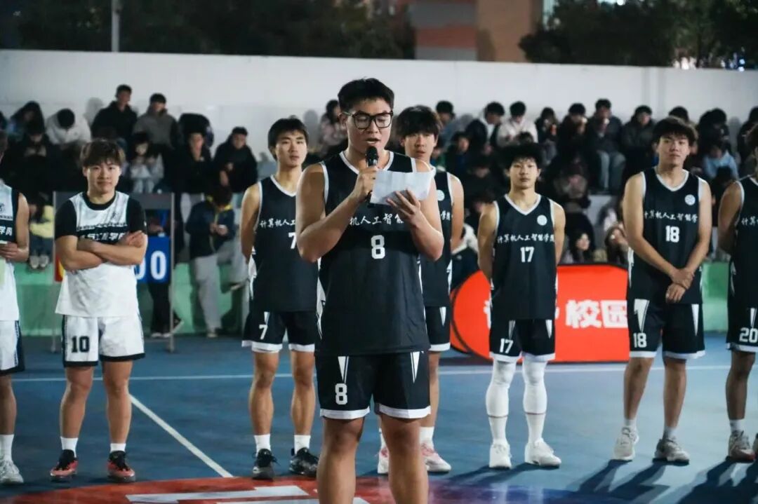 计算机与人工智能学院8号球员熊浩语代表全体运动员宣誓。他表示,运动员们将严格遵守比赛规则,坚决服从裁判,尊重对手,尊重观众,以饱满热情,认真比赛,发扬顽强拼搏精神,胜不骄、败不馁,赛出风格、赛出水平,发挥出最佳成绩。