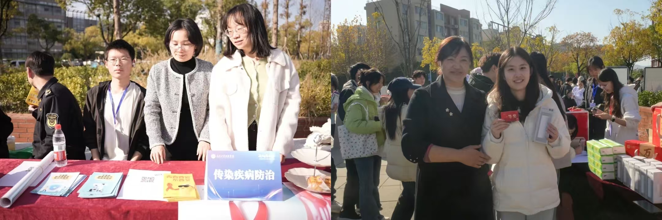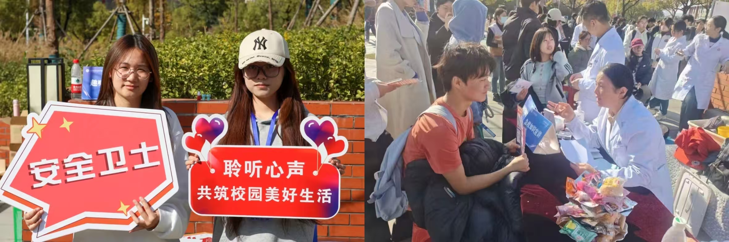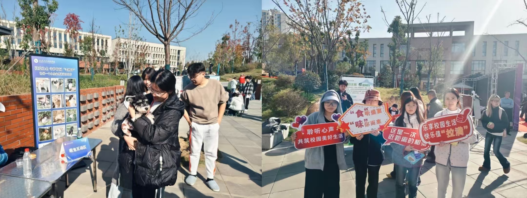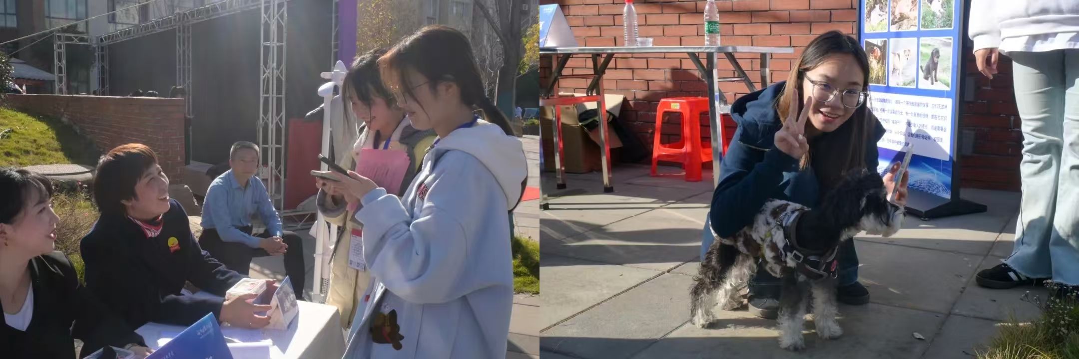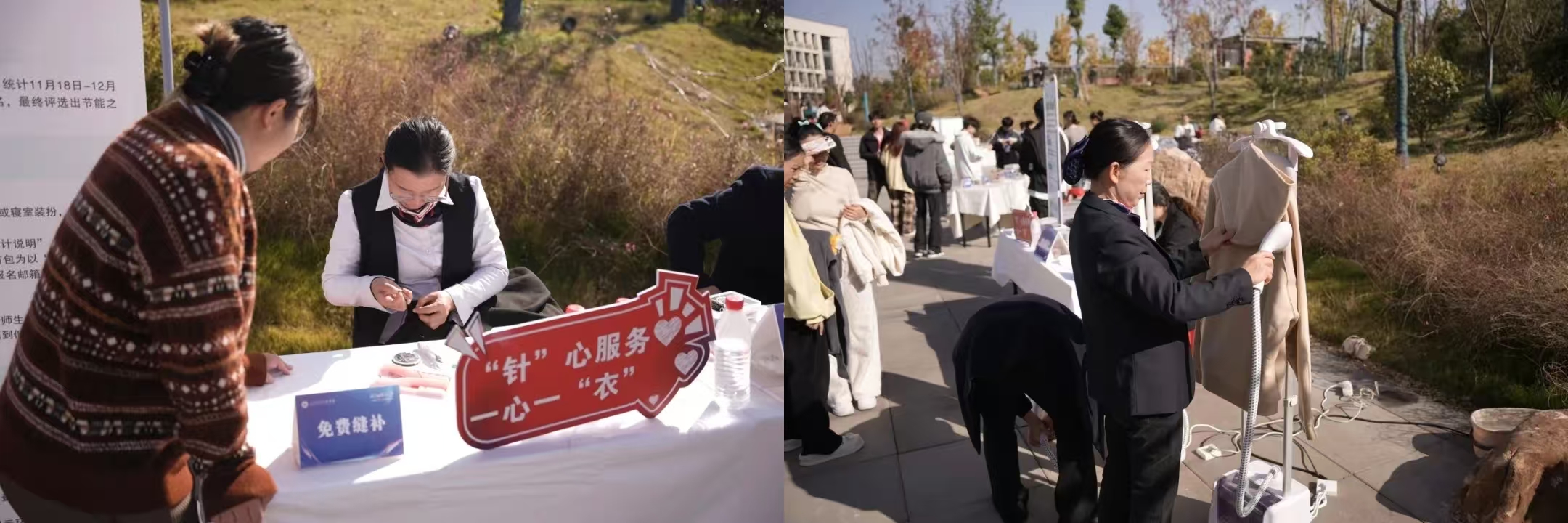 “暖心服务区”和“趣味活动区”则聚焦师生日常需求,融合服务体验与休闲互动。现场设有后勤综合事务办理、维修登记、义诊服务,并提供免费衣物缝补、眼镜清洁、手机贴膜等暖心便民服务。此外,主题拍照打卡点与萌宠互动区也吸引了不少师生驻足参与,大家在轻松愉快的氛围中放松身心,感受校园生活的多样魅力。