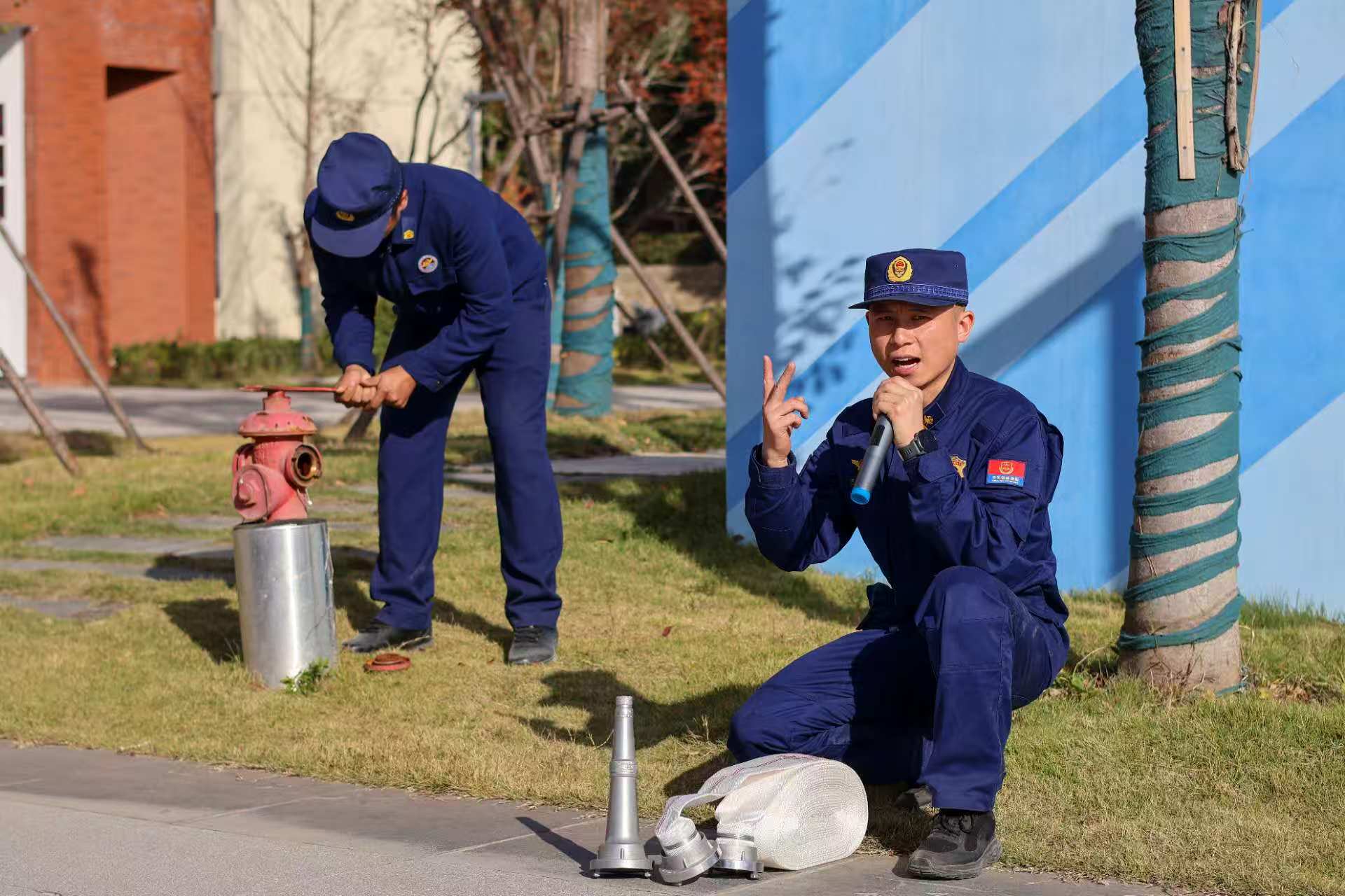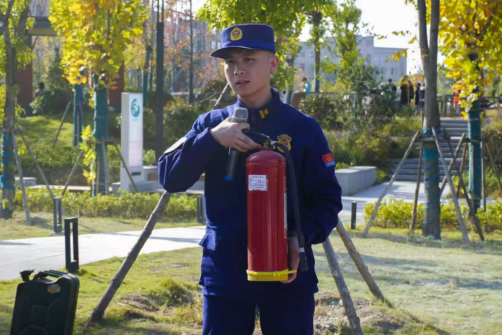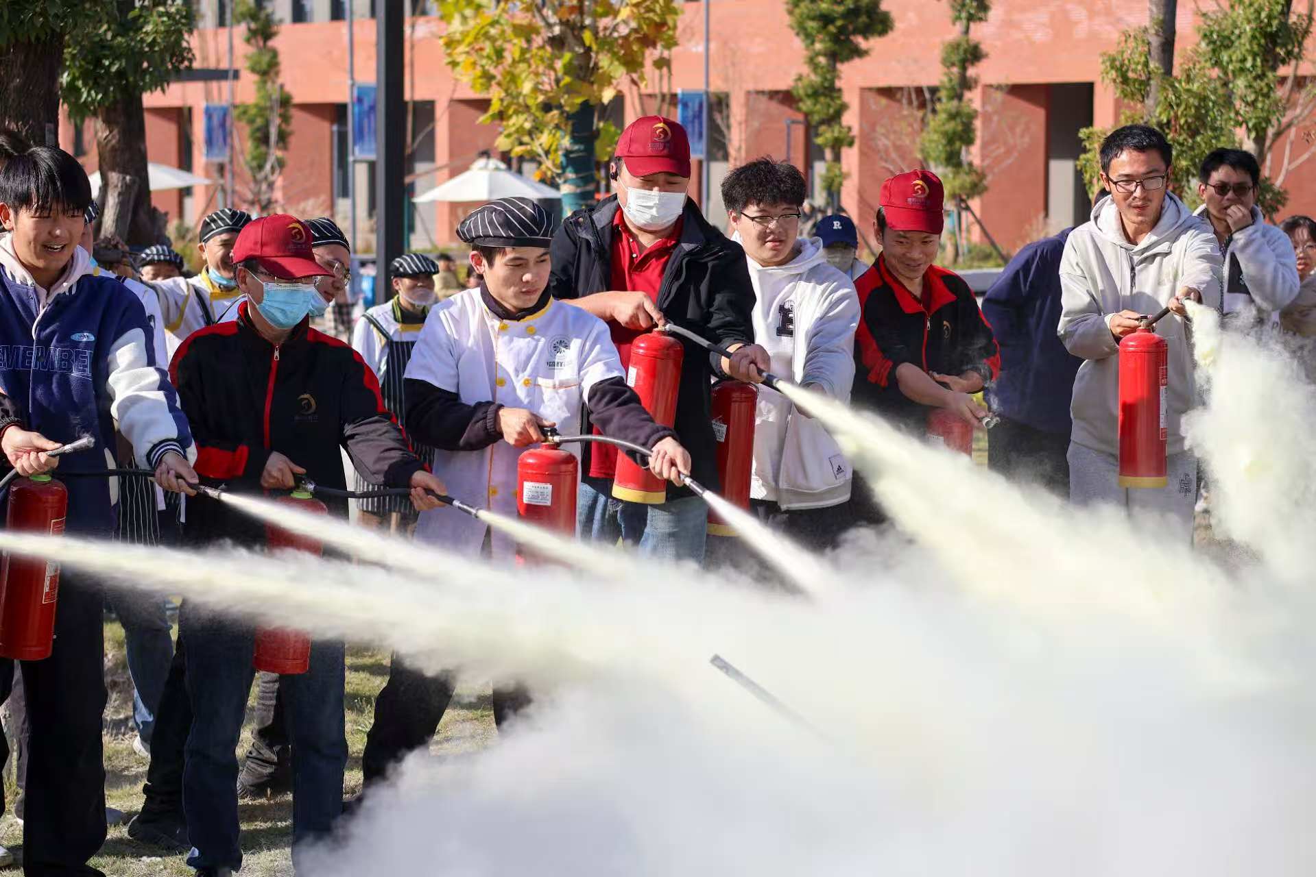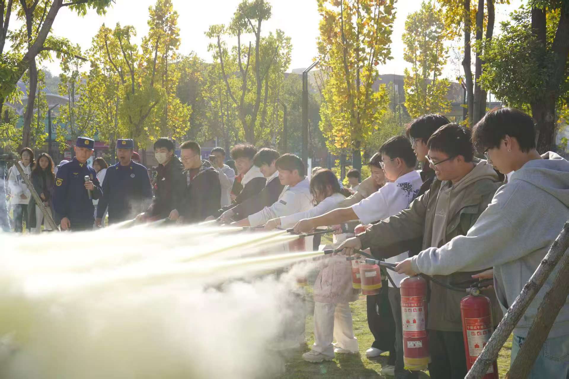 实操演练中,消防员汪峰现场示范灭火器“提、拔、握、压”操作要领,并指导师生及工作人员进行实操。参训人员踊跃参与,通过亲身体验扎实掌握了灭火技能。