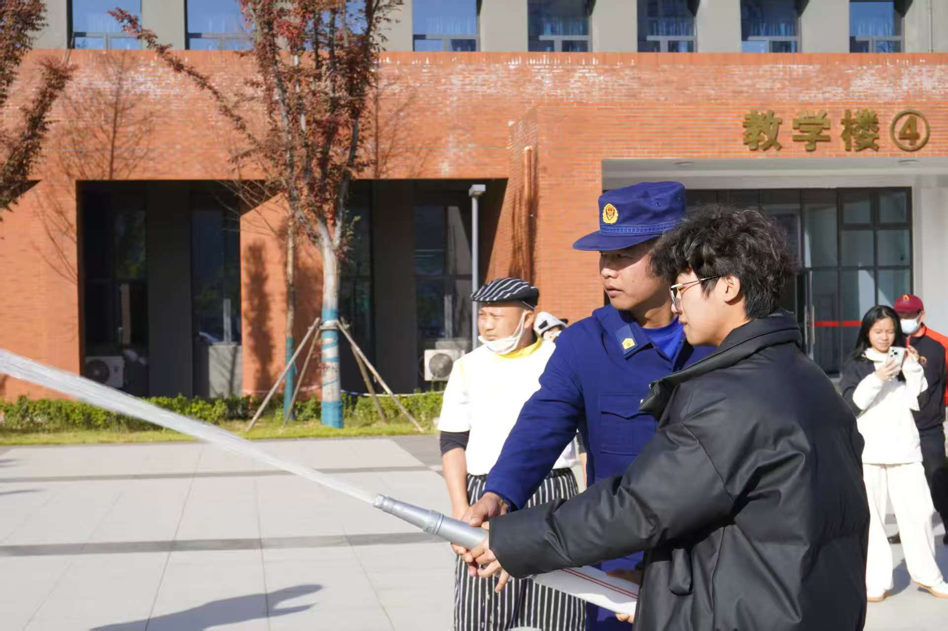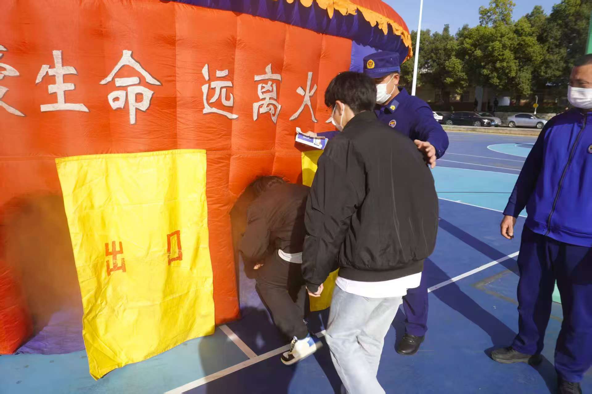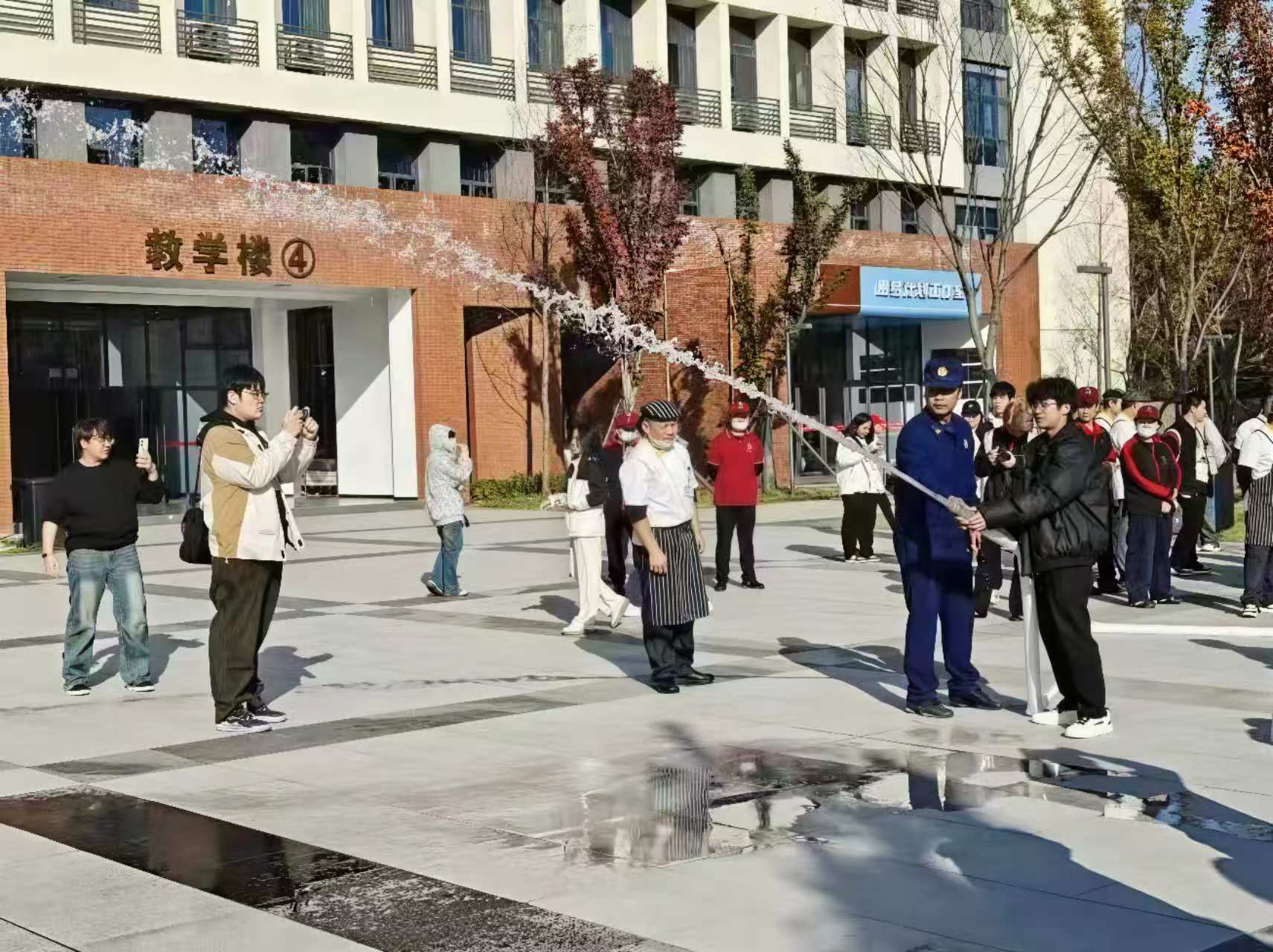 在四号教学楼前的室外消火栓处,师生代表在消防员指导下分组练习水带铺设与接口连接;灯光篮球场内设置的“消防逃生帐篷”中,学生们严格按照培训要领,捂住口鼻,低姿弯腰,快速有序地通过模拟浓烟环境;八号学生宿舍楼内,新生代表在消防员指引下完成了模拟火场疏散逃生演练。通过系列实战演练,进一步提升师生应对突发火情的处置能力。