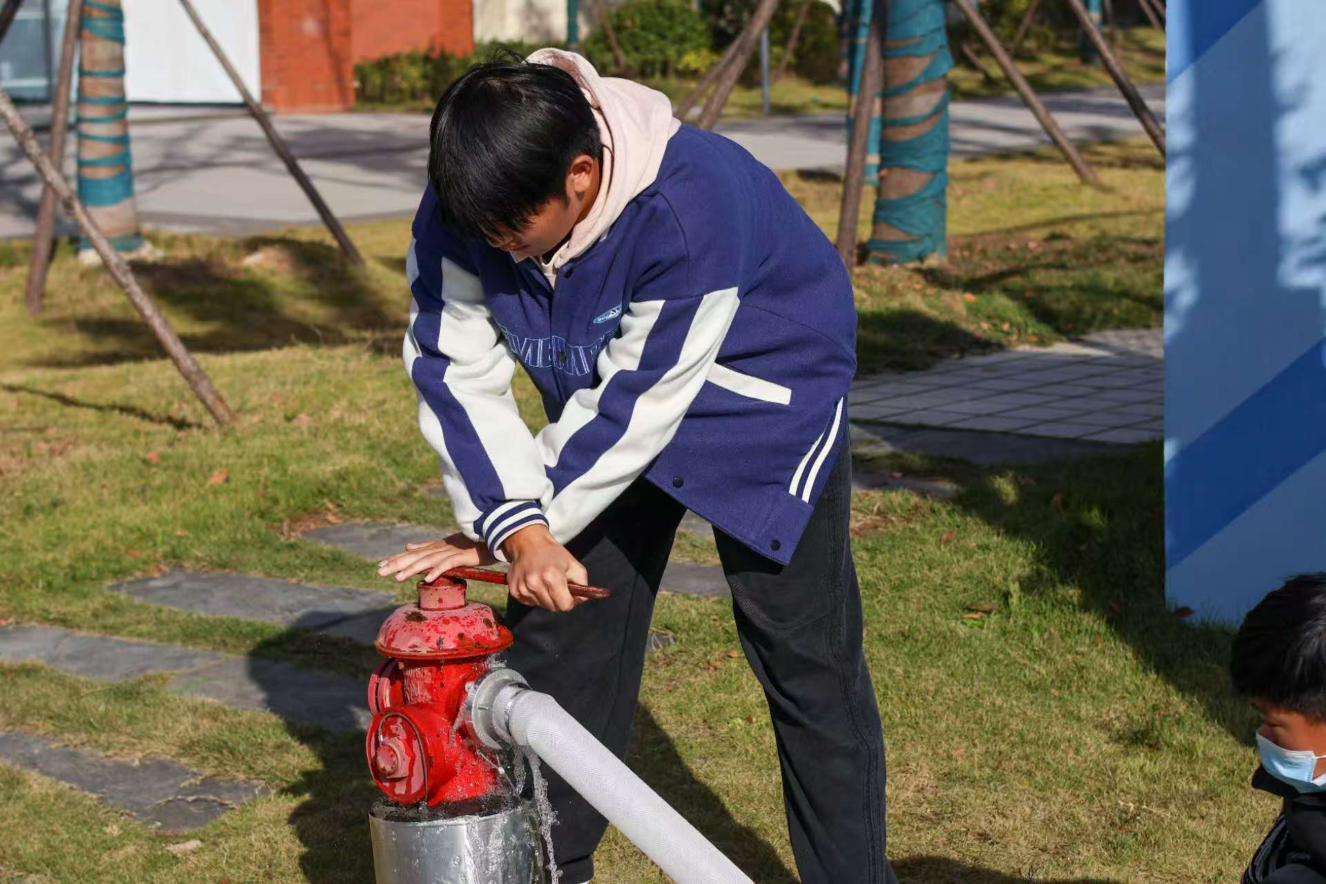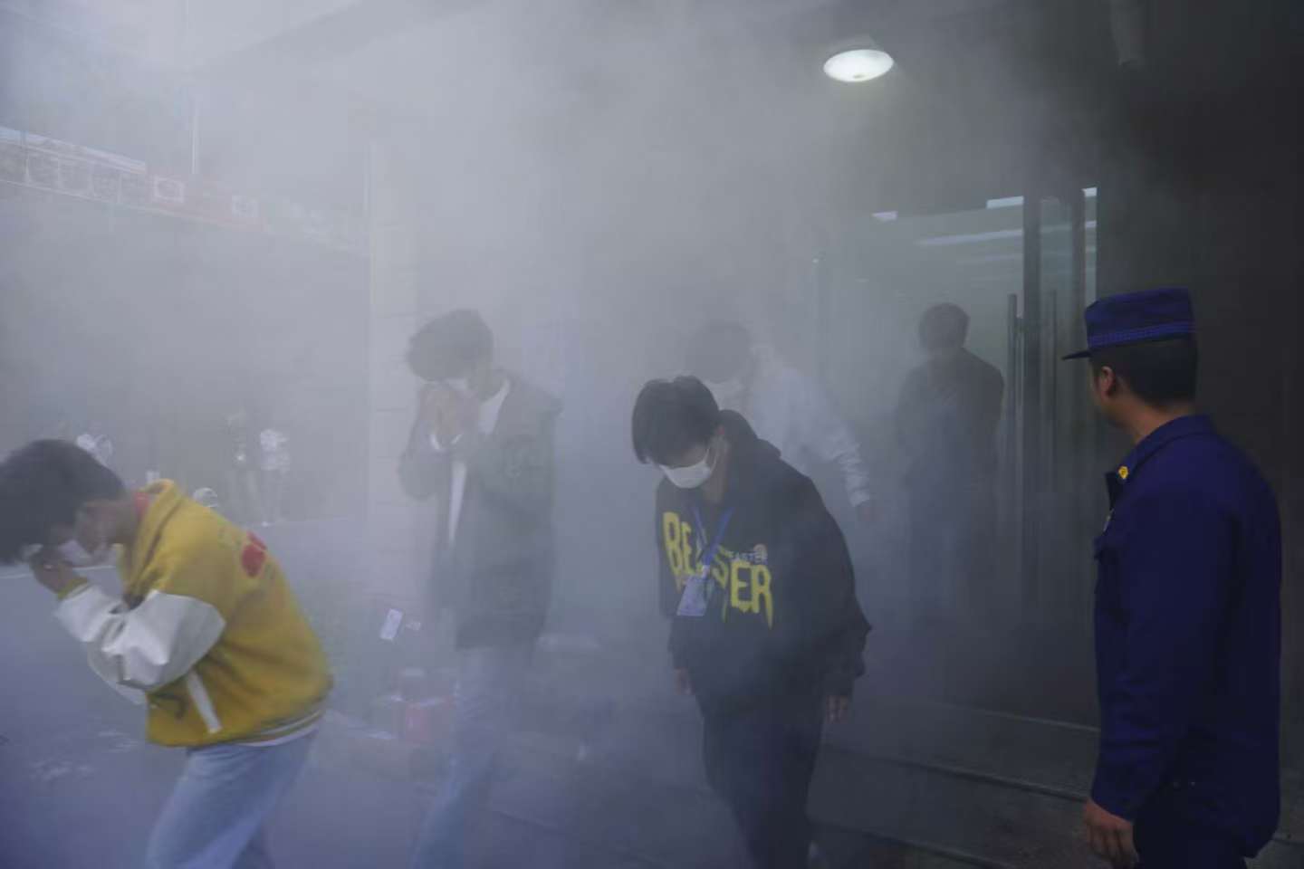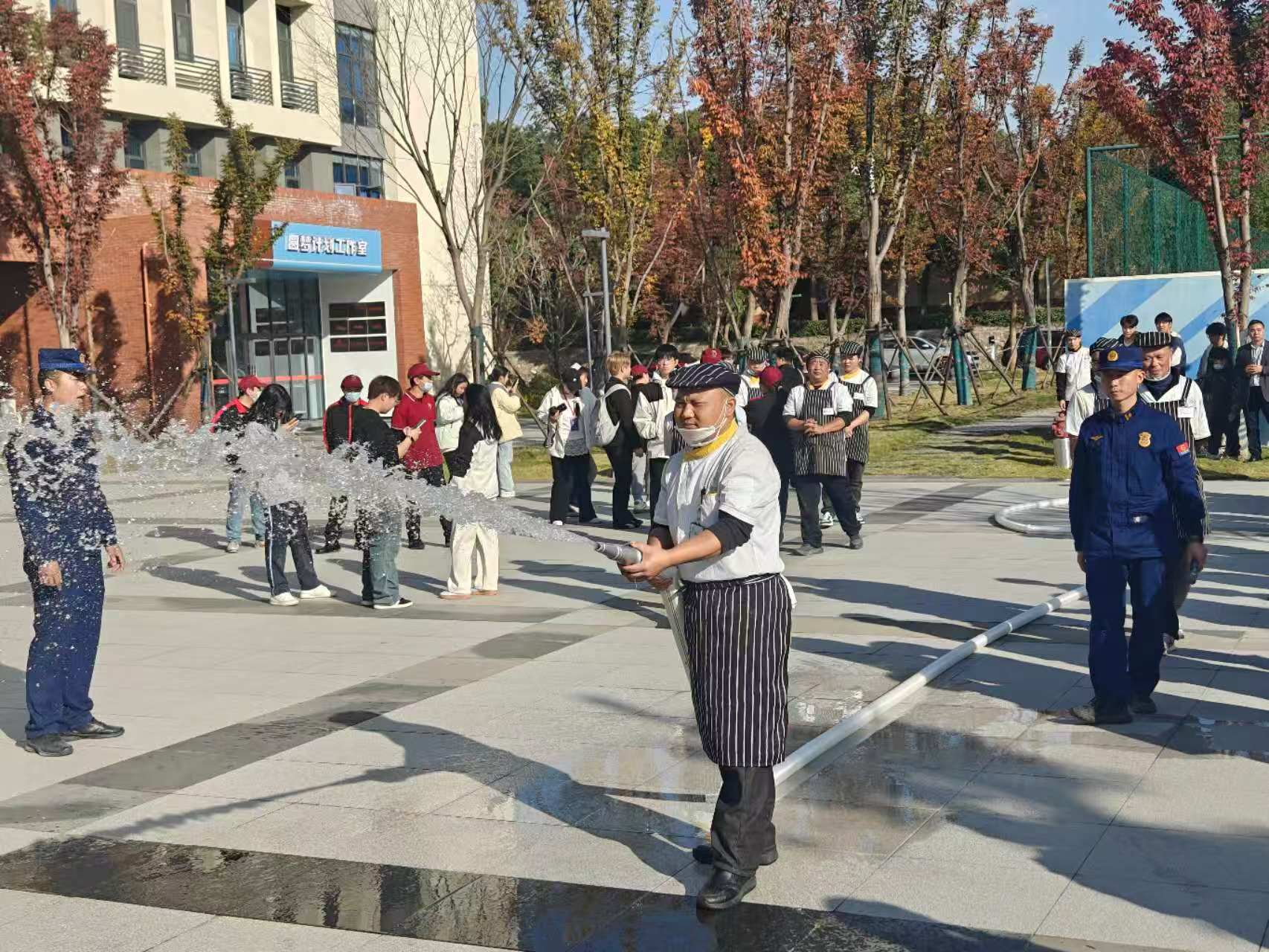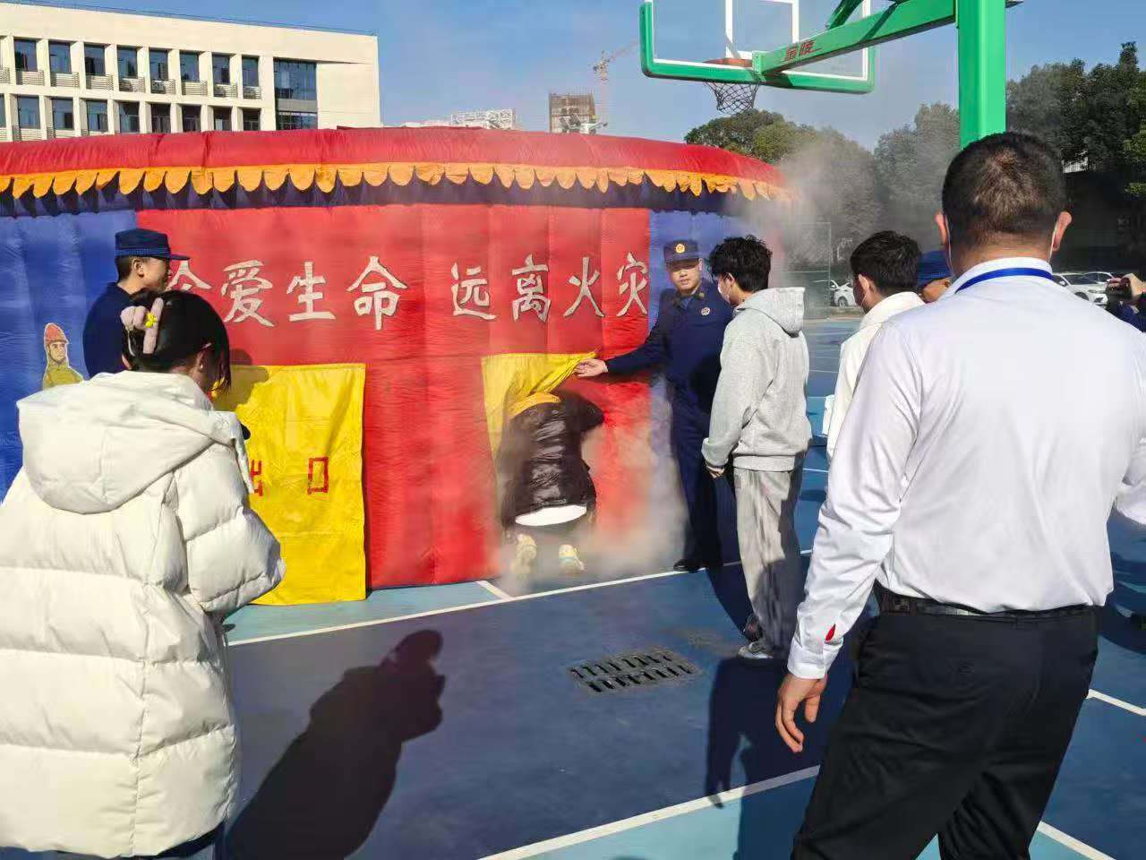 在四号教学楼前的室外消火栓处,师生代表在消防员指导下分组练习水带铺设与接口连接;灯光篮球场内设置的“消防逃生帐篷”中,学生们严格按照培训要领,捂住口鼻,低姿弯腰,快速有序地通过模拟浓烟环境;八号学生宿舍楼内,新生代表在消防员指引下完成了模拟火场疏散逃生演练。通过系列实战演练,进一步提升师生应对突发火情的处置能力。