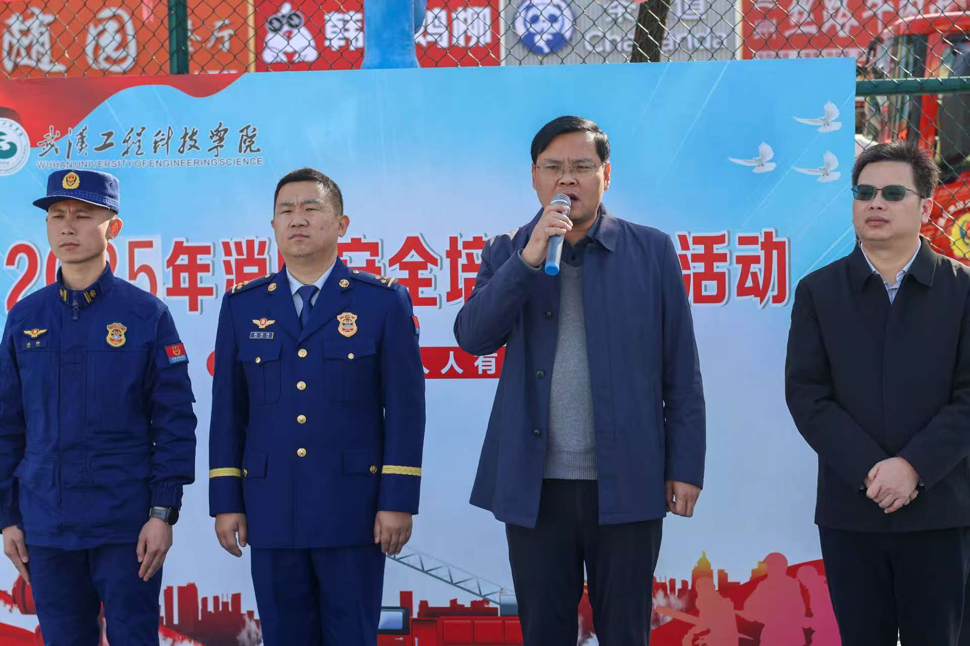 为积极做好第34个全国消防月的消防安全宣传工作,进一步筑牢校园消防安全防线,增强全校师生的消防安全意识和应急处置能力,11月26日下午,武汉工程科技学院在灯光篮球场成功举办了2025年校园安全活动月启动仪式暨消防应急演练。学校常委、校长助理郭万春出席活动,后勤保卫处、党政办公室、学生工作处、校团委、教务处等职能部门负责人,各学院书记、学工科长、辅导员、实验员、学生代表,以及保安、楼管员、食堂与商户代表等500余人参与活动。江夏区消防救援局纸坊站副站长沈冰洋一行到校指导开展消防演练。启动仪式由治安消防中心主任万汉峰主持。