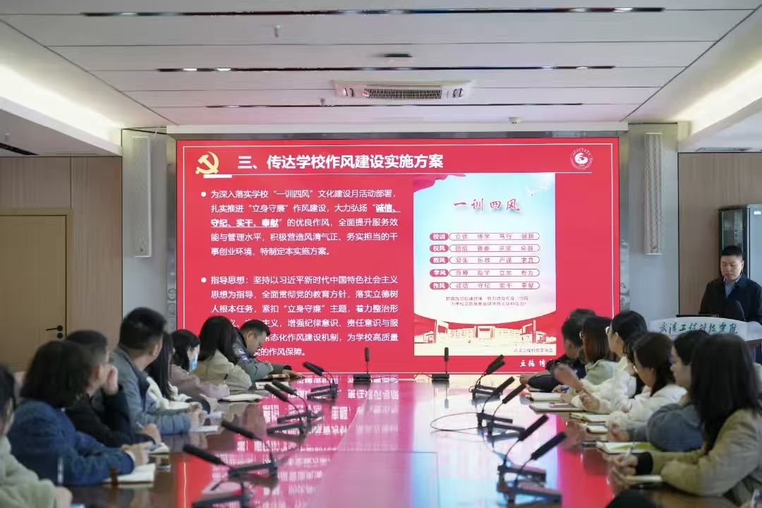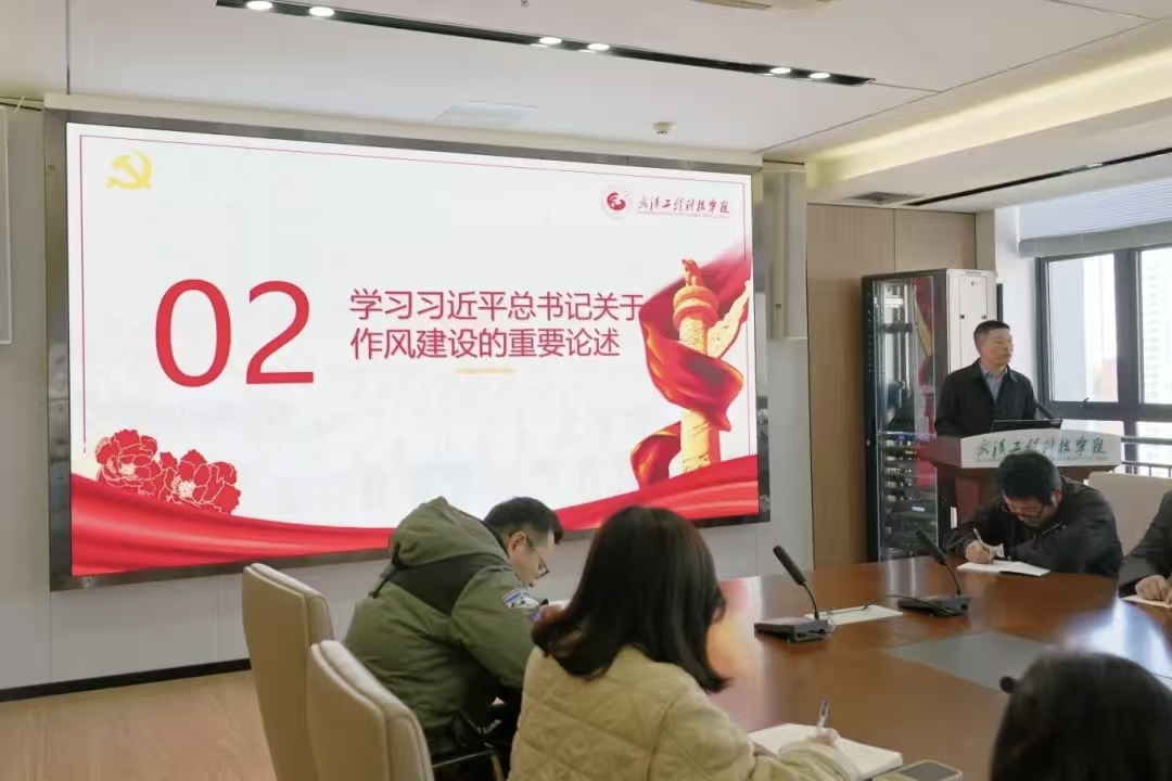 吴夏传达《武汉工程科技学院作风建设的实施方案》文件精神。方案以“立身守廉”为主线,提出建立作风建设机构、完善两级学习机制、整治不良工作作风、落实首问负责制度、强化工作纪律管理、推进清廉校园建设、畅通投诉信访渠道七项具体举措,旨在全面提升管理服务效能,营造风清气正、务实担当的工作环境。同时,在机关各部门中设立“党员先锋岗”,通过亮身份、践承诺、强监督,促进党员干部带头立足本职岗位践行“诚信、守纪、实干、奉献”的作风要求。