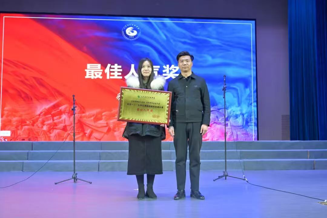 继续教育学院党总支书记刘占业为人文学院颁发大合唱最佳指挥奖。