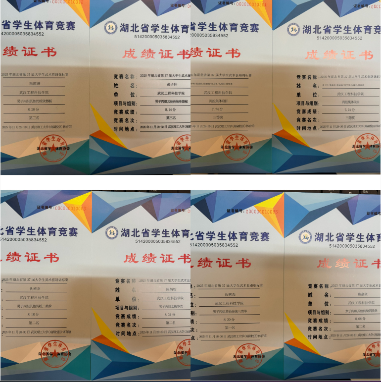 11月28日至30日,由湖北省大学生体育协会主办的湖北省第37届大学生武术套路锦标赛在武汉理工大学体育馆隆重举行。武汉工程科技学院武术队在领队易鹏老师、教练员高俊和黎文老师的率领下,派出6名运动员参加了共计十一个单项的角逐。队员们不畏强手,奋力拼搏,最终凭借精湛的技艺与出色的发挥,在个人项目与团体荣誉上均取得历史性突破,共斩获1金、4银、2铜的优异成绩,并荣膺“体育道德风尚奖”,充分展现了我校学子昂扬的精神风貌和深厚的体育素养。