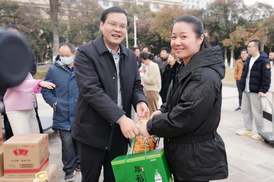 冬日暖阳,情满校园。为传递学校对全体教职工的深切关怀,营造和谐温馨的节日氛围,12月22日下午,武汉工程科技学院在综合楼东广场暖心举办教职工新年福利物资发放活动。全体校领导亲临现场,亲手将满载祝福的新年福利礼包递送到教职工手中,并向大家致以诚挚的新年问候。