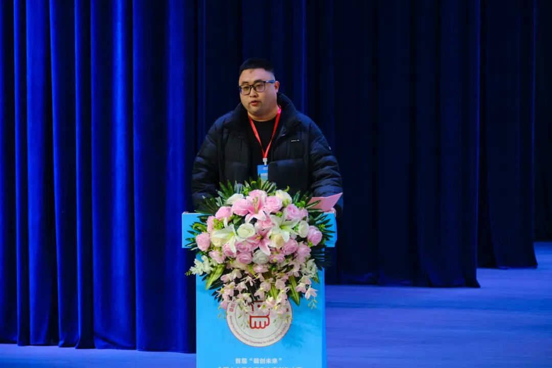 山东凯锐思动物营养有限公司品牌总监孙国涛发言。他表示,凯锐思品牌此次参与大赛并非单纯的“赞助”,而是为了向青年学习,让专业更有温度。他指出,凯锐思品牌坚持完善专业能力,重视与年轻人的语言沟通。他指出,大赛不仅是见证创意,更期待把“科学”变成“共情”,与青年共创——让专业营养,长出情感的根。最后,他预祝大赛圆满成功,愿参赛者在创造中收获成长,让热爱绽放光芒。