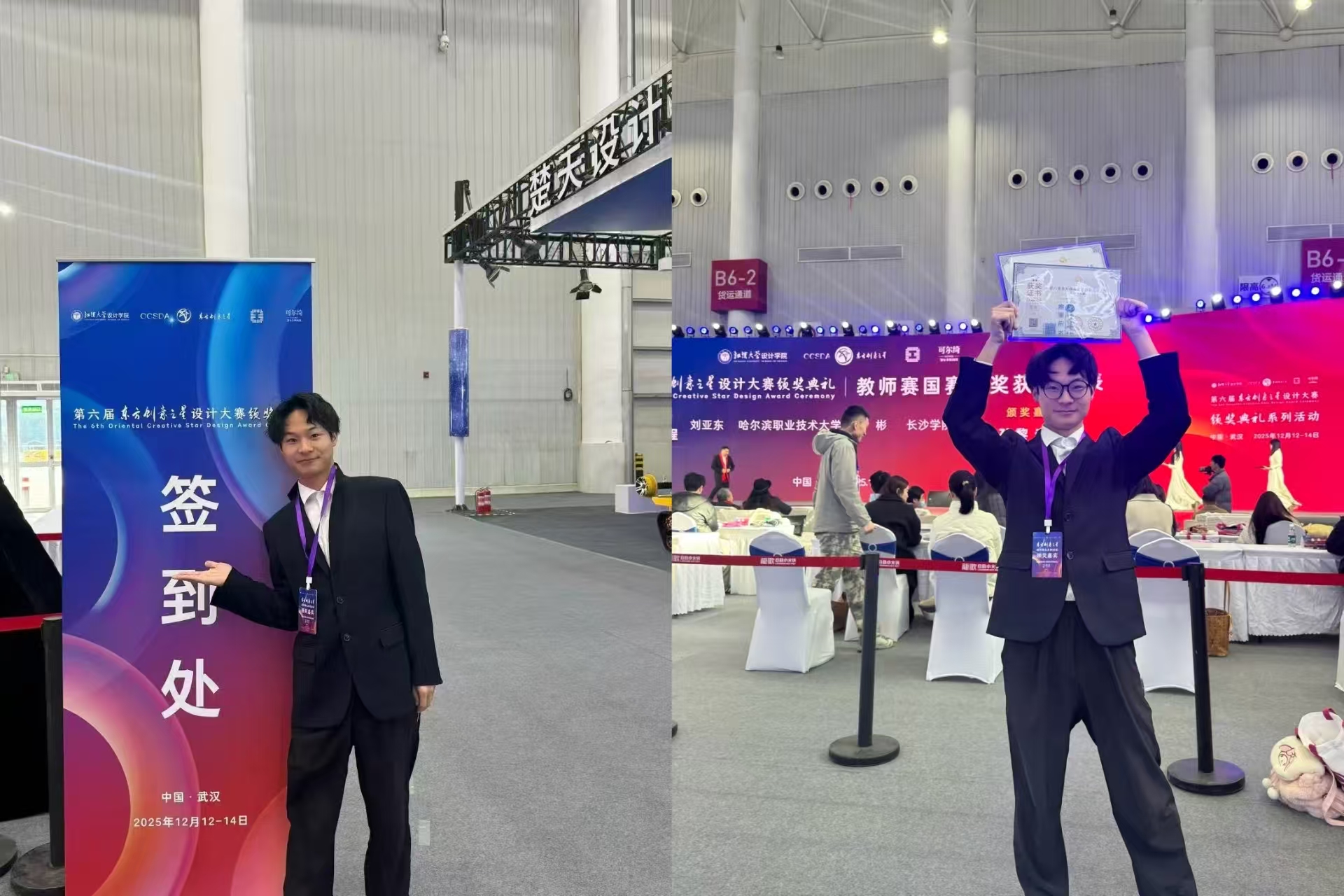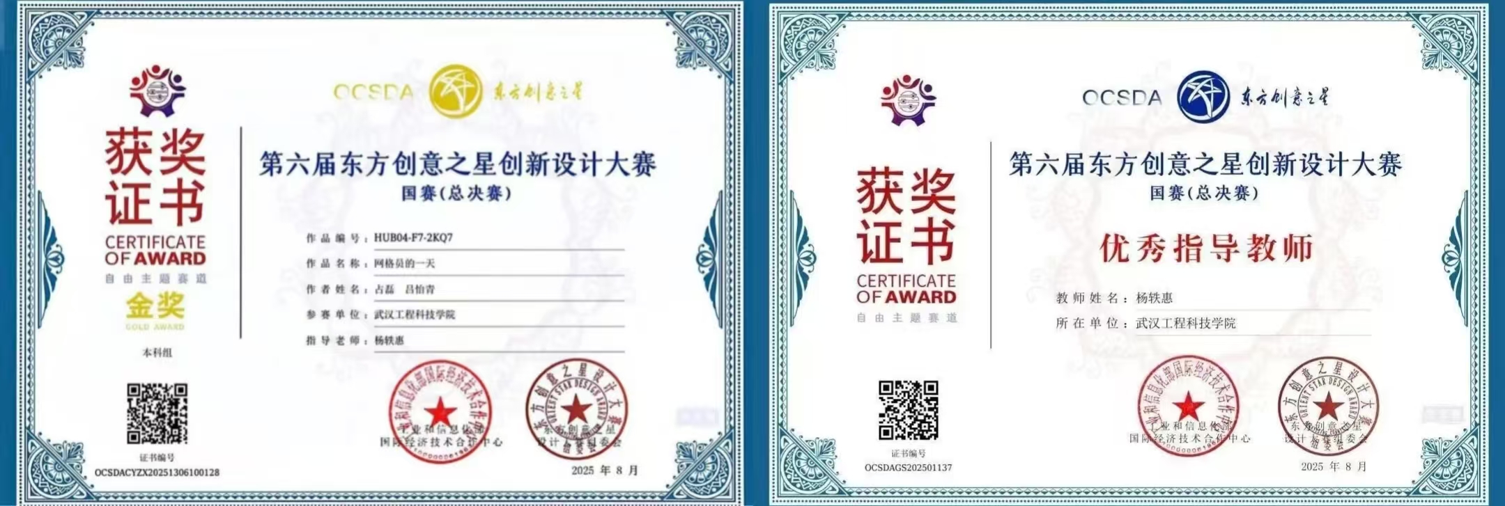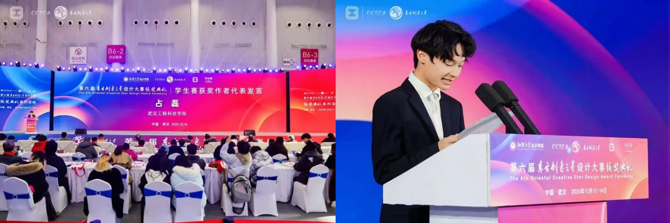 近日,2025武汉国际工业设计博览会工业设计产教融合专题活动在武汉国际博览中心隆重举行,第六届东方创意之星创新设计大赛颁奖典礼作为2025武汉国际工业设计博览会的重要组成部分同步圆满举办。武汉工程科技学院艺术与传媒学院2022级广播电视编导专业学生占磊、吕怡青的作品《网格员的一天》,在全国数万件参赛作品中脱颖而出,斩获全国总决赛金奖。杨轶惠凭借专业指导荣获优秀指导老师奖。同时,占磊以扎实的专业实力与亮眼表现,成功当选为本届赛事学生发言代表。