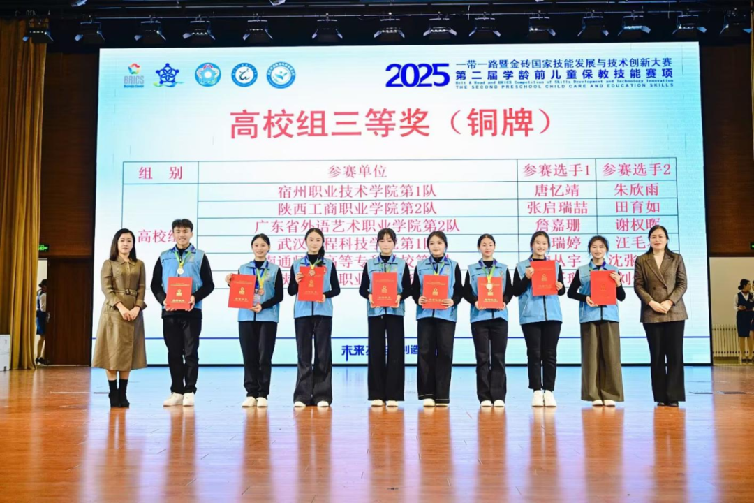 12月18日至22日,2025“一带一路”暨金砖国家技能发展与技术创新大赛第二届学龄前儿童保教技能赛项决赛顺利落下帷幕。该赛事为国家级A类竞赛,武汉工程科技学院人文学院学前教育专业选派李瑞婷、汪毛羽、林瑒婧、张梦紫四位同学组成两组代表队参赛,在教师王雄燕、仲竞华、陈萍、汝利娜的指导下,凭借扎实的专业功底、娴熟的实操技能与沉稳的现场发挥,在全国86支高校代表队、166名选手中脱颖而出。其中,李瑞婷、汪毛羽一组荣获全国总决赛铜牌,张梦紫、林瑒婧一组获得优秀奖,展现出优秀的职业素养与专业实力,为学校赢得荣誉。