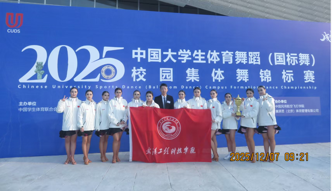 12月4日至8日,由中国学生体育联合会主办的2025年中国大学生体育舞蹈(国标舞)校园集体舞锦标赛在四川成都举行。经过多日的紧张比拼与精彩展演,我校代表队凭借精湛的舞技、出色的编排与饱满的舞台表现力,在众多强队中脱颖而出,最终荣获甲组青春校园舞R组第五名,甲组青春校园舞J组第一名的优异成绩!此外,我校崔子涵、石玉娇两位同学在比赛中表现尤为突出,荣获“优秀运动员”称号,展现了武汉工程科技学院学子卓越的专业素养与青春风采。