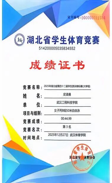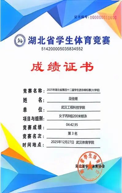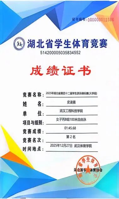 2025年12月27日,2025年湖北省大学生游泳锦标赛在武汉体育学院成功举办。武汉工程科技学院14名学生在郭生鼎、李明老师的带领下,最终斩获女子100米自由泳单项第二名、女子50米自由泳单项第三名、女子200米蛙泳第三名。