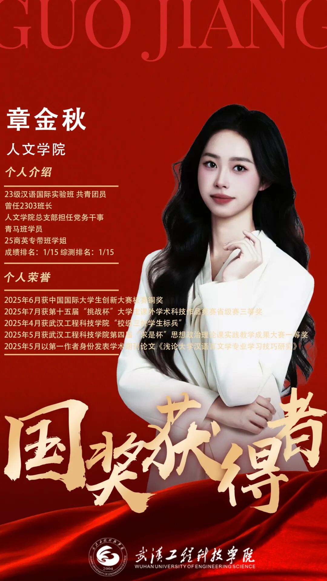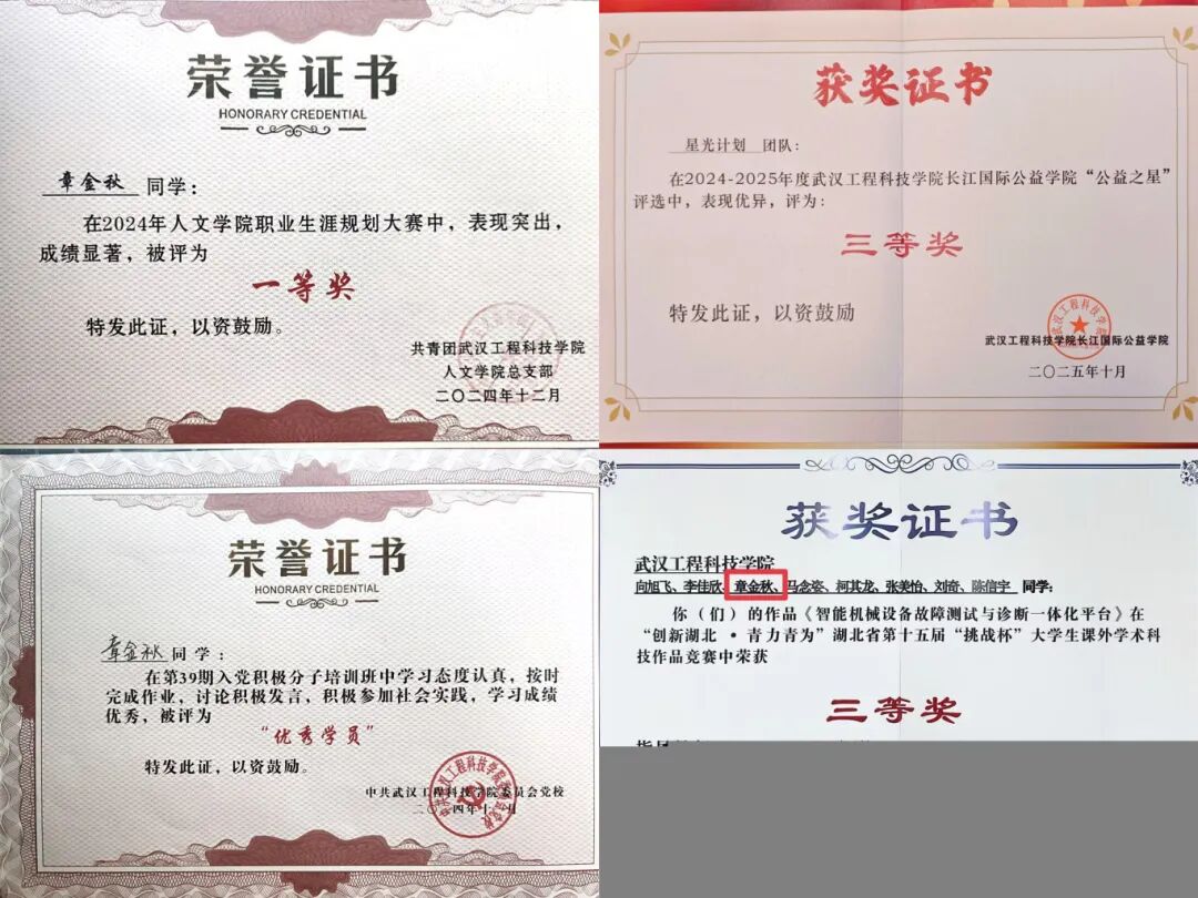 在武汉工程科技学院,章金秋始终与“拼搏”“担当”同行。面对学业、竞赛与学生工作的多重压力,她坚信“关关难过关关过”。在学术与竞赛中,她成绩突出:2025年4月被评为校级“三好学生标兵”;5月获“求是杯”思政课实践教学成果大赛一等奖,并以第一作者发表《浅论大学汉语言文学专业学习技巧研究》一文;6月获中国国际大学生创新大赛校赛铜奖;7月获“挑战杯”省级三等奖。作为班级成绩与综测双第一,她的学习秘诀是:“专注自身节奏,积极与老师沟通,按时完成任务,定期复盘反思。