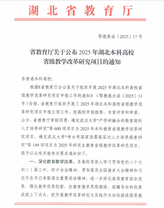 近日,湖北省教育厅正式公布《省教育厅关于公布2025年湖北本科高校省级教学改革研究项目的通知》,我校共有4个项目成功获批,立项数量创新高。