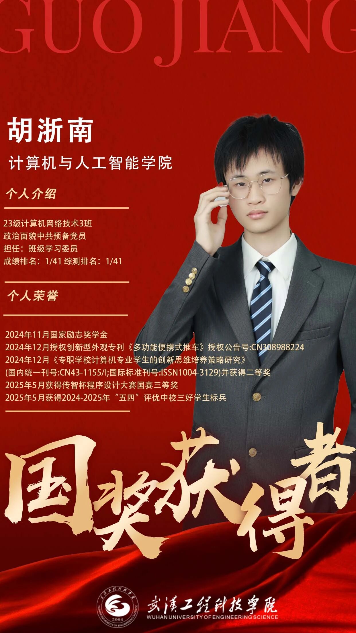 “这份荣誉,是学校悉心栽培的见证,是指导老师倾囊相授的成果,更是同窗挚友携手同行的馈赠。”2023级计算机网络技术专业的胡浙南在获得国家奖学金后如此感慨。他以清晰的规划和扎实的努力,在大学里留下了坚实的成长足迹。