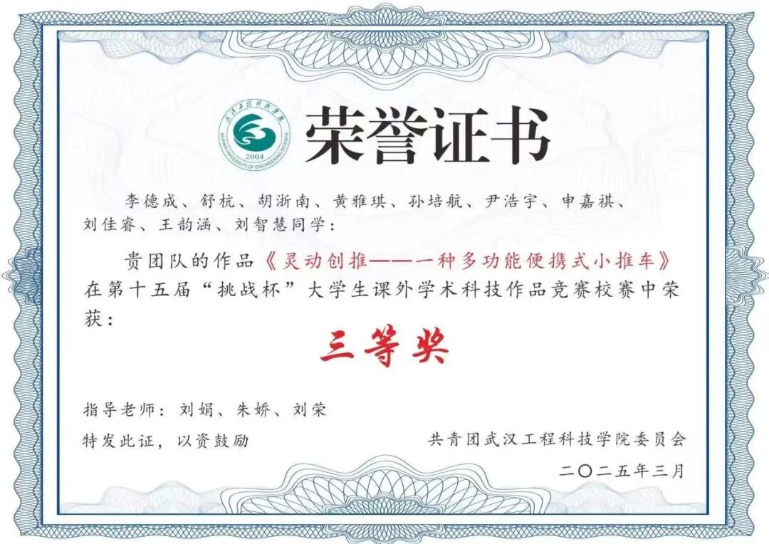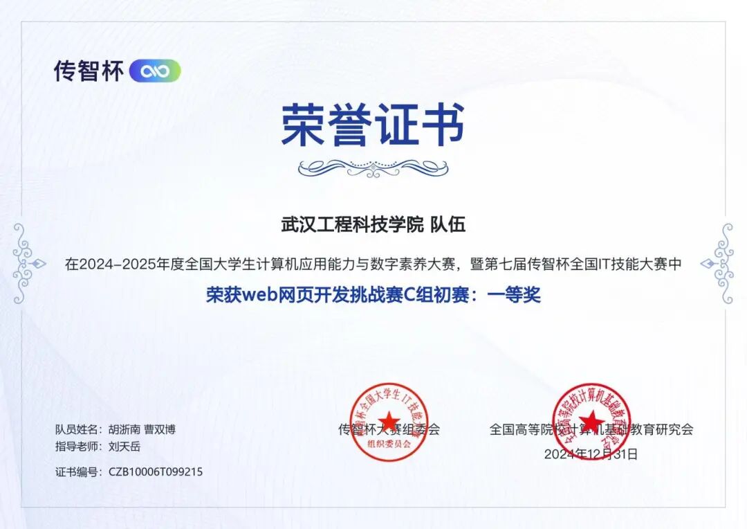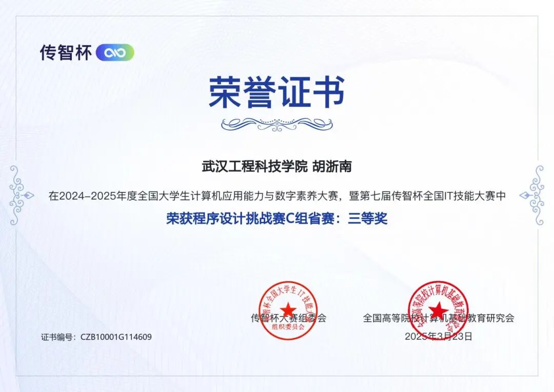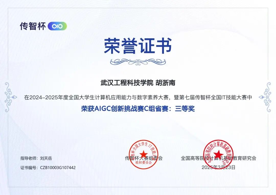 初入校园,胡浙南就明白专业基础的重要性。课堂上他专注听讲、积极互动,疑难问题及时请教,成绩始终名列前茅,连续获得综测第一。在学好专业课的同时,他也注重拓展综合能力,积极参与各类实践。他将所学转化为实际成果,结合学习体会与行业趋势,发表了《专职学校计算机专业学生的创新思维培养策略研究》论文;又从日常观察出发,设计出“多功能便携式推车”,获得外观专利授权,体现了“知行合一”的理念。在竞赛中,胡浙南同样表现出色。他参加了“传智杯”程序设计大赛、全国大学生数学能力挑战赛、AIGC创新挑战赛等多项赛事。凭借扎实的数学功底与灵活的思维,他在全国大学生数学能力挑战赛中荣获二等奖;在AIGC创新挑战赛中,他将专业与新技术结合,展现出优秀的创新潜能。此外,他还获得了“传智杯”国赛三等奖、省赛三等奖等多项荣誉。