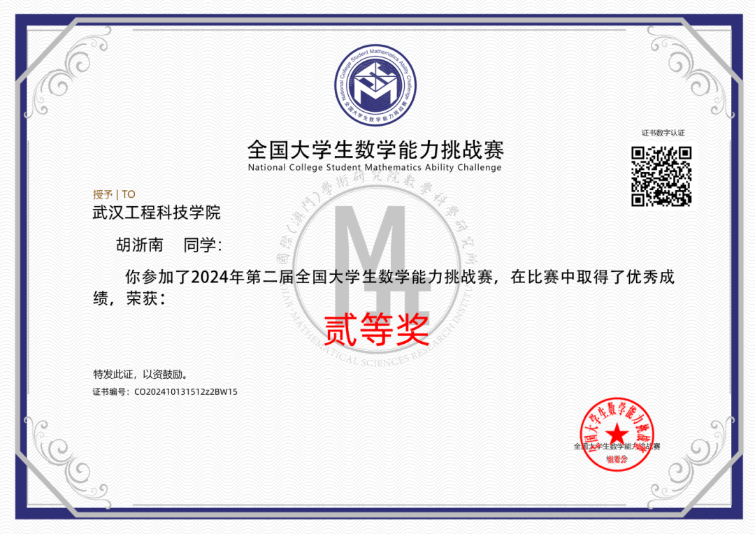 成长之路并非总是一帆风顺。胡浙南印象最深的是:参加华中杯数学建模大赛的经历。“那是我第一次参与高强度的团队竞赛,虽然结果不如预期,但过程中的收获让我受益终身。”在学长带领下,他与队友连续三天通宵解题,经历过困顿与挫折,却从未有人放弃。“我们互相鼓励、共克难关。”尽管未能获奖,但这次经历让他深刻体会到团队协作的力量,也锻造了他不畏挑战的毅力。“正是这些‘不完美’,让我走得更加坚定。”