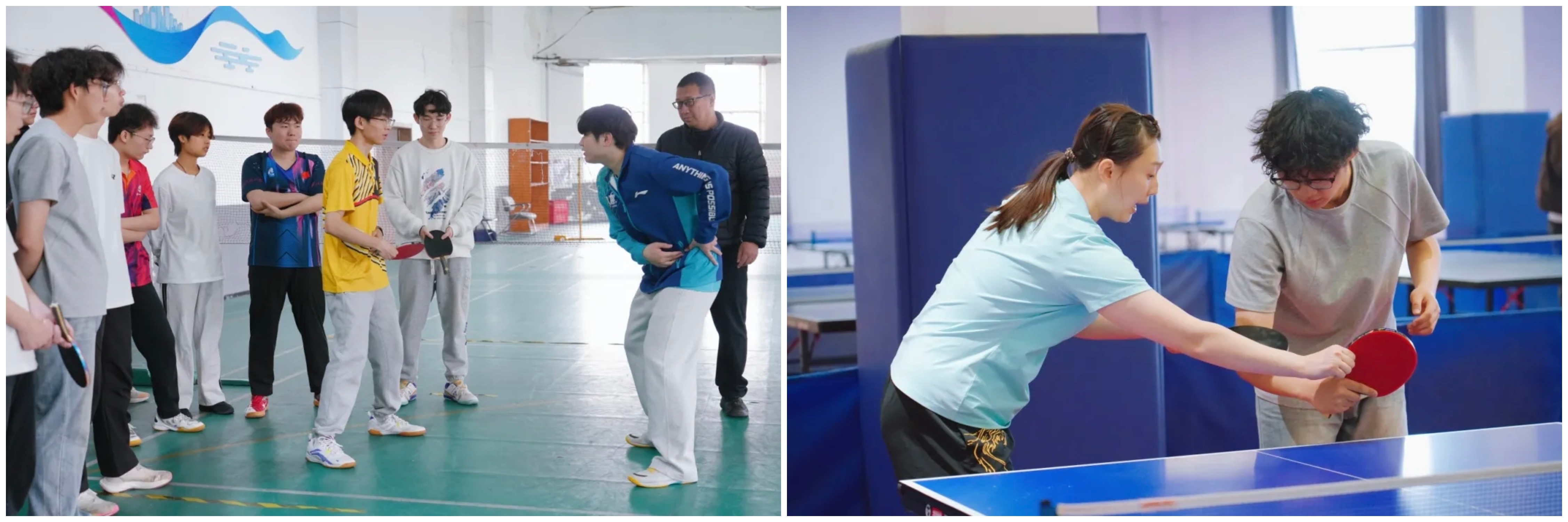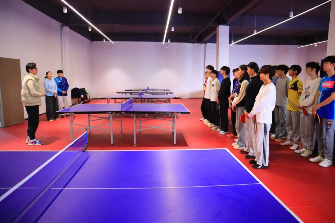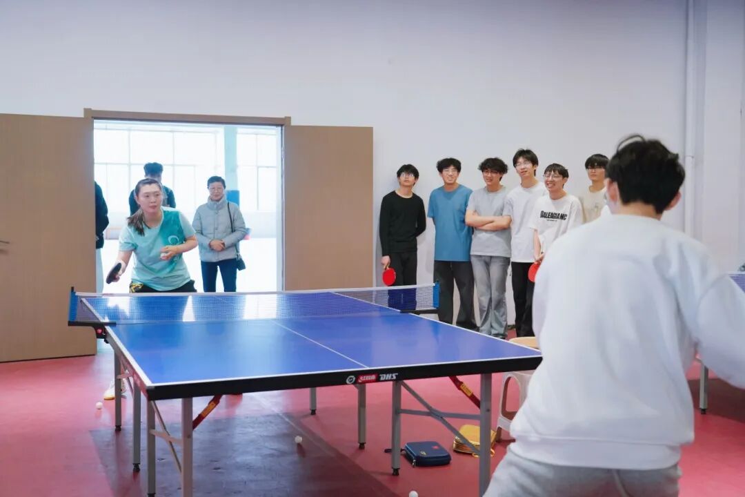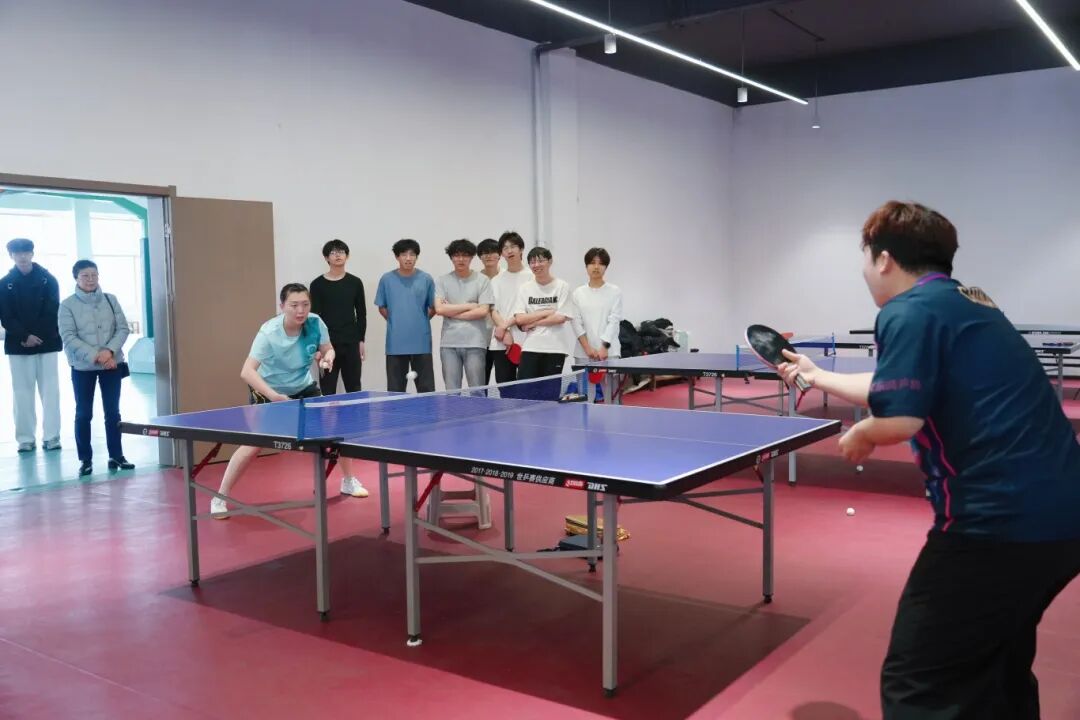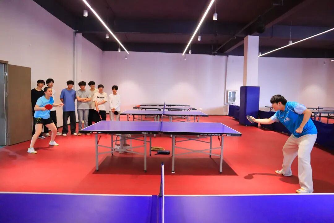 下午三点,两位运动员的到来瞬间点燃了现场师生的热情。在简短的交流后,郭雨涵和吴润泽与我校2024级体育系乒乓球专项班的同学们进行了基础的对拉练习。尽管只是简单的热身,但两位职业运动员精准的控制和潇洒的动作,依然让在场观战的同学们大呼过瘾,近距离感受到了顶级运动员的专业风采。