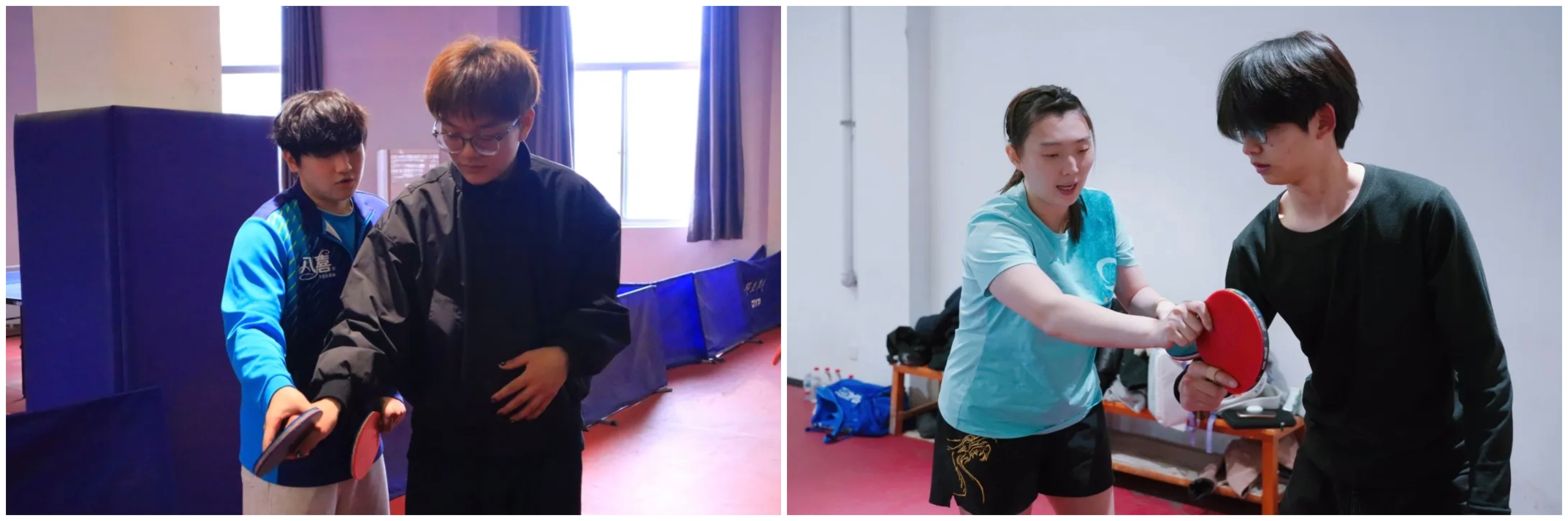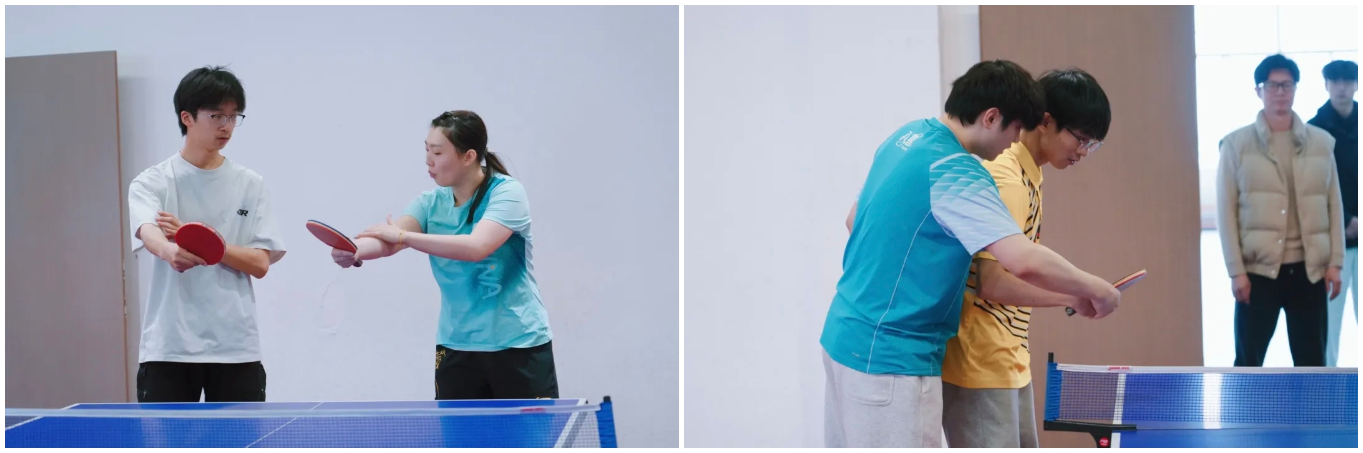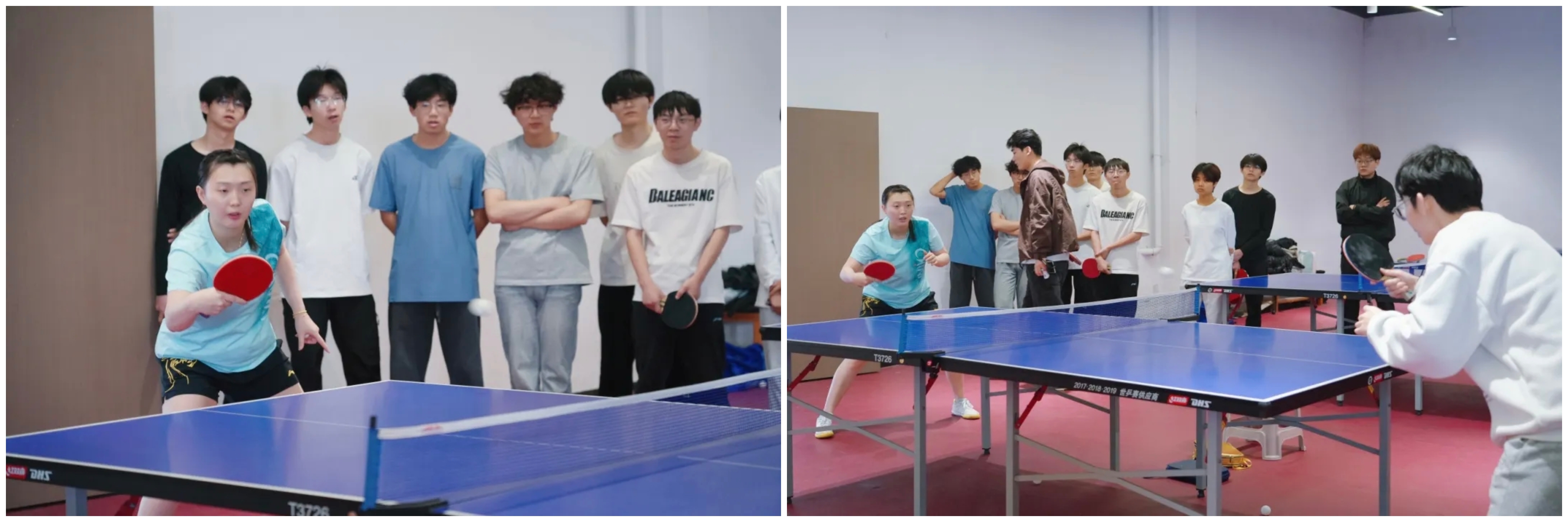 下午三点,两位运动员的到来瞬间点燃了现场师生的热情。在简短的交流后,郭雨涵和吴润泽与我校2024级体育系乒乓球专项班的同学们进行了基础的对拉练习。尽管只是简单的热身,但两位职业运动员精准的控制和潇洒的动作,依然让在场观战的同学们大呼过瘾,近距离感受到了顶级运动员的专业风采。
