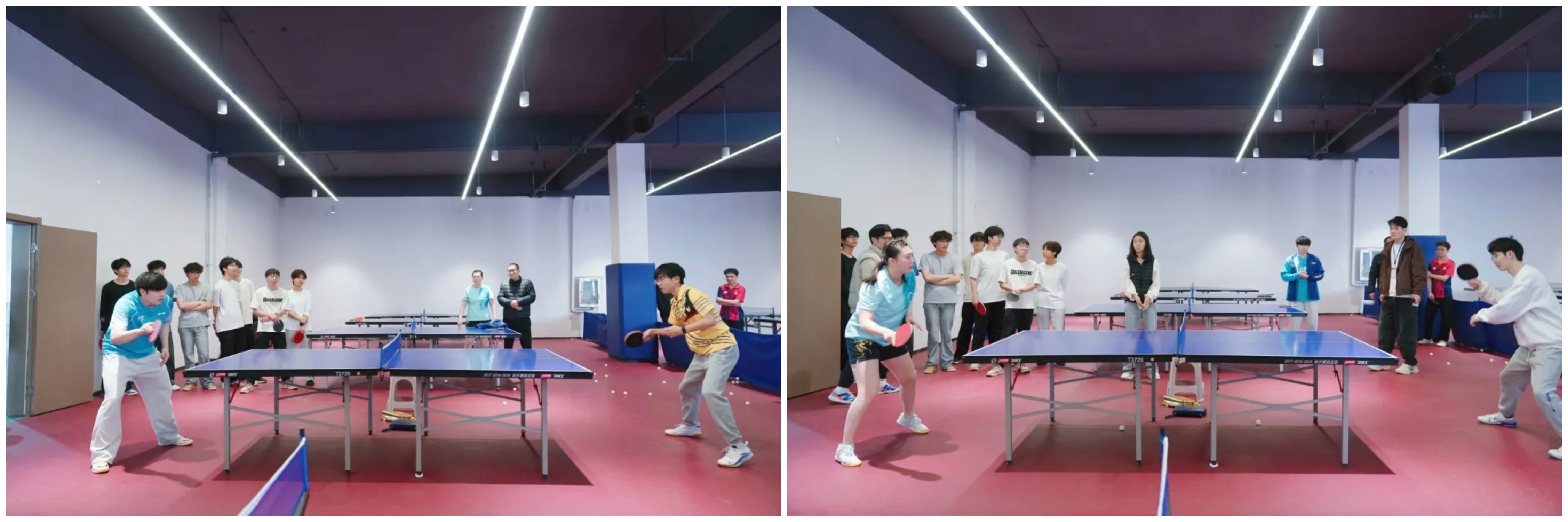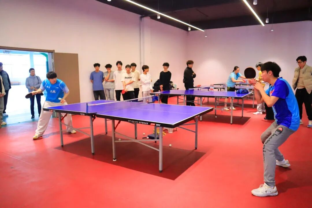 随后进行的师生友谊赛,虽然双方实力存在差距,但上场的同学们毫无惧色,敢于拼搏。吴润泽在比赛中展现出高超的球技,时而轻搓短球,时而大力扣杀,引得现场惊叹连连;郭雨涵则展现了女子选手的灵巧与坚韧,多拍回合中的精彩防守赢得了雷鸣般的掌声。现场气氛热烈,加油声、喝彩声交织在一起,青春的活力与乒乓的魅力在乒乓球馆内完美融合。