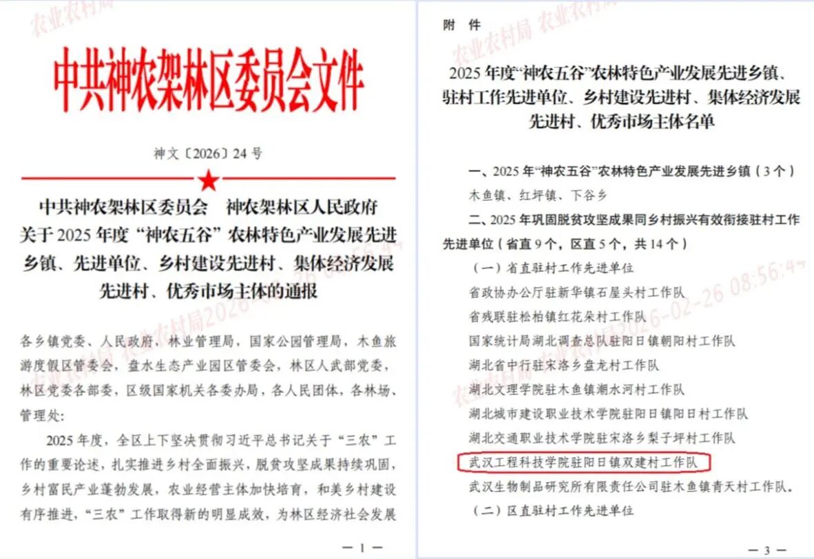 近日,在神农架林区党委农村工作会议上,武汉工程科技学院驻阳日镇双建村工作队获评2025年度巩固脱贫攻坚成果同乡村振兴有效衔接省直驻村工作“先进单位”荣誉称号,连续第三年获此殊荣。