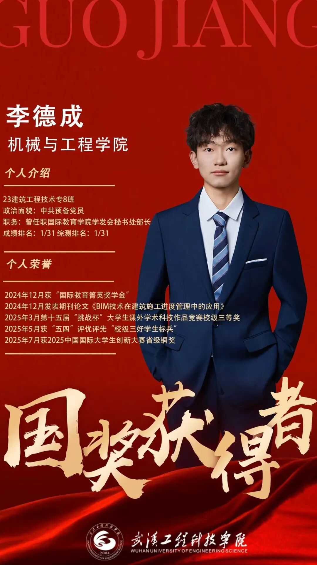 路虽远,行则将至;梦虽艰,追则必圆。李德成一直怀揣着申请国家奖学金的梦想,并由此踏上了漫长的追梦之旅。他坦言:“一开始我也很迷茫,是这个梦想在心底不断呼唤我,它就像一座灯塔,指引着我不断向它靠近。即便这条道路荆棘丛生,我也始终坚信,应当坚守自己的梦想。”带着这份信念,他潜心向学、不断积累、持续完善自我,学业成绩与综合能力均实现了质的飞跃。“不积跬步无以至千里,不积小流无以成江海。”他在日复一日的点滴努力中积淀知识、锤炼本领,最终站上了国奖的领奖台。