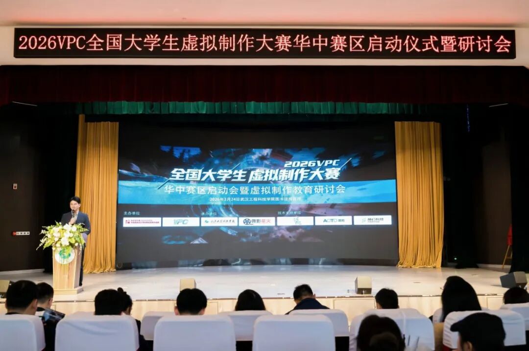 3月24日上午,2026年VPC全国大学生虚拟制作大赛华中赛区启动会暨虚拟制作教育研讨会在武汉工程科技学院举行。武汉工程科技学院党委副书记、副校长廖璐莎,VPC全国大学生虚拟制作大赛执行委员会主任谢宁,武汉工程科技学院艺术与传媒学院院长沈祥胜,来自湖北工业大学、中南林业科技大学涉外学院、湖北工业大学工程技术学院、文华学院、武汉工程大学邮电与信息工程学院、武汉晴川学院、武汉传媒学院相关院系领导、企业专家与我校师生代表齐聚一堂,共同见证华中赛区正式启航,共话虚拟制作前沿发展与产教融合新未来。活动由VPC全国大学生虚拟制作大赛组委会主办,武汉工程科技学院微影星火数字传媒产业学院承办。